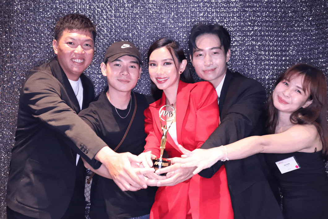 Hoa hậu Thùy Tiên (giữa) nhận giải thưởng ở Singapore cho dự án 'Đu đêm'.