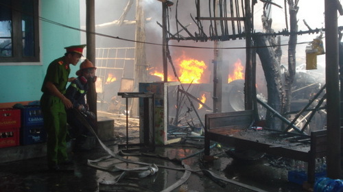 | Lực lượng PCCC Bình Định đang triển khai công tác chữa cháy tại gara |
