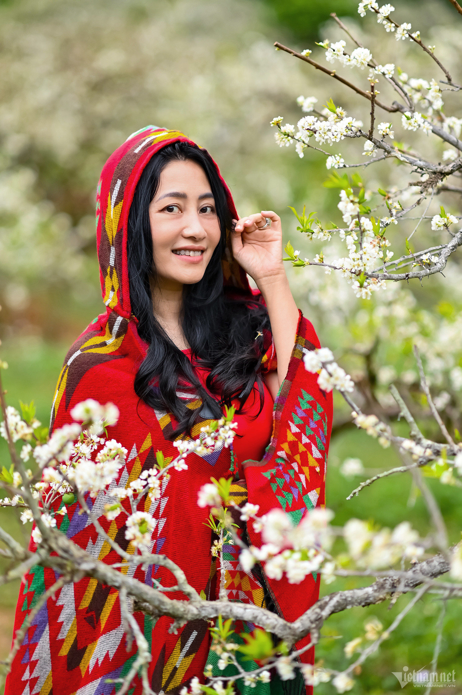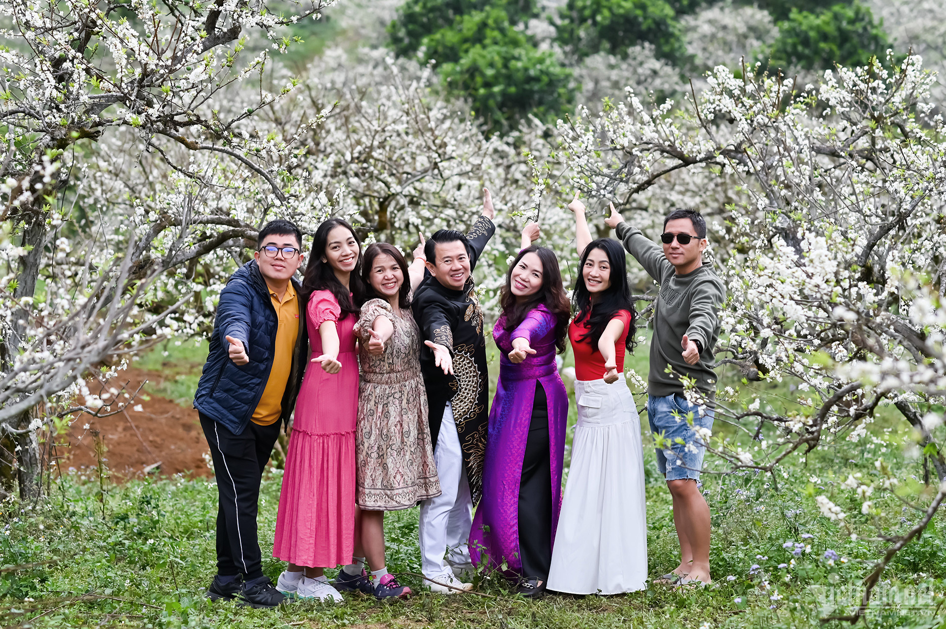 Gia đình chị Hương (đến từ Thái Nguyên) chuẩn bị kỹ càng bộ đồng phục màu đỏ để được nổi bật giữa rừng hoa trắng.