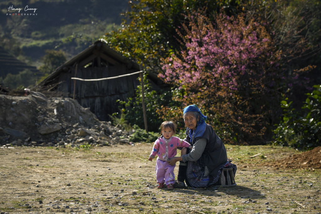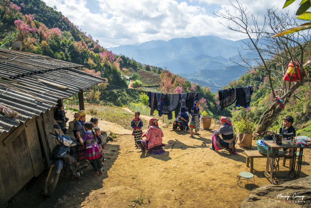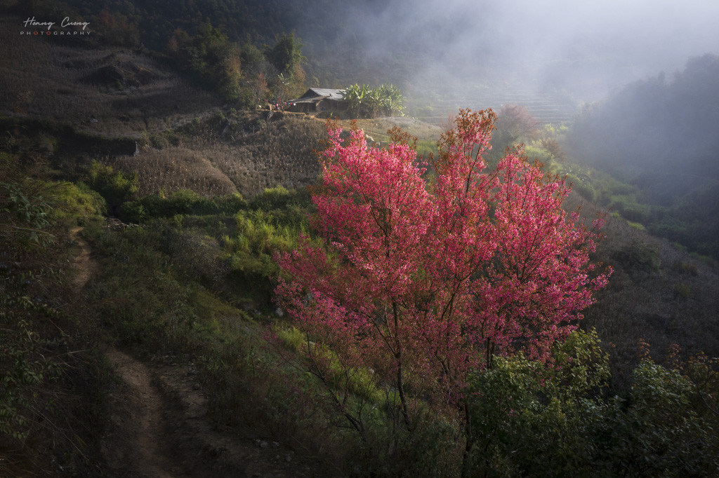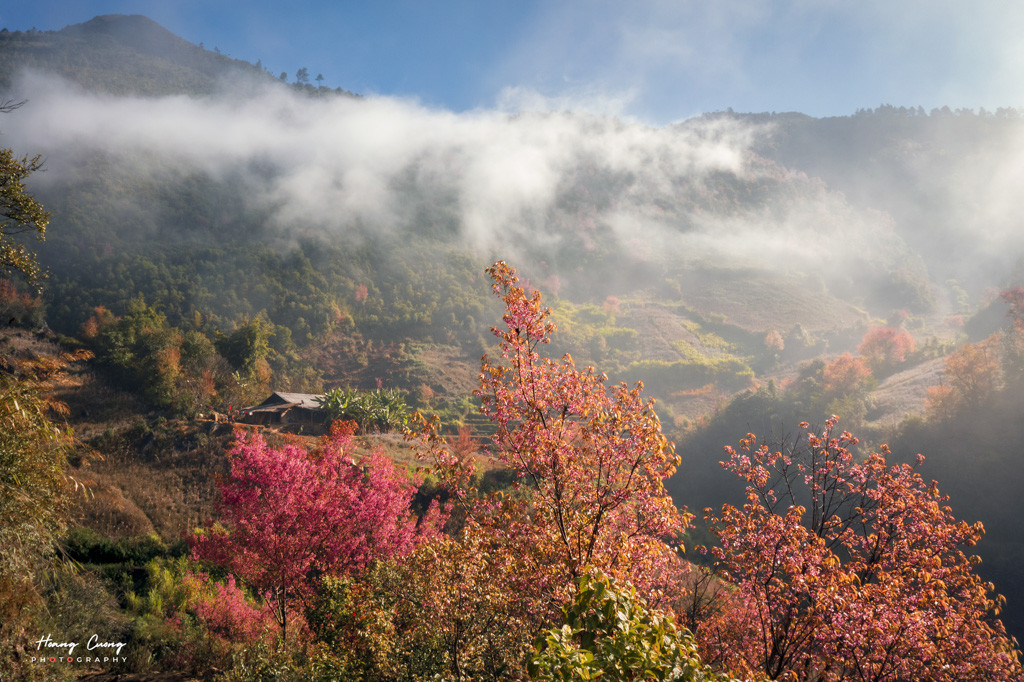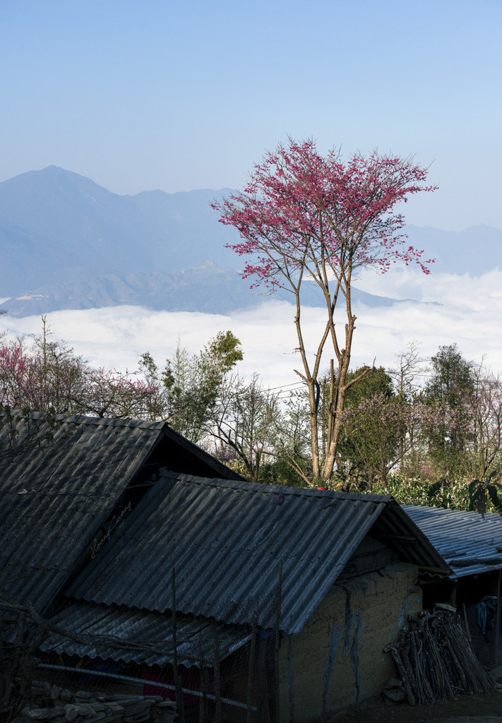 Không chỉ có những triền núi được thay áo mới, hầu hết những căn nhà của người dân bản đều có bóng đào rừng cổ thụ bung nở trên những nóc nhà.Nhìn từ xa, những ngôi nhà trình tường như chìm trong làn sương hồng mờ ảo.