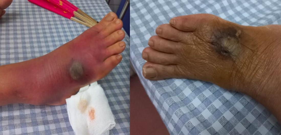 Khi vào viện, tại trung tâm vết cắn đang có dấu hiệu hoại tử ướt. Người bệnh được chỉ định nhập viện điều trị tại Khoa Bệnh nhiệt đới.