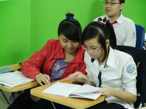 | Đôi bạn cùng tiến Hoàng Lan và Hương Giang (ASE B201) trao đổi bài trong giờ học |