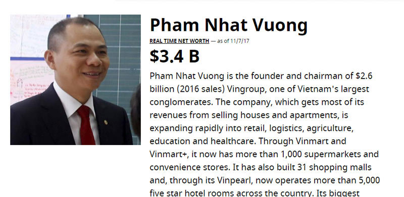 Theo Forbes, tính tới 7/11/2017, tổng giá trị tài sản của ông Phạm Nhật Vượng (49 tuổi) là 3,4 tỷ USD, tăng tròn 1 tỷ USD so với trong bảng xếp hạng của tạp chí này hồi tháng 3/2017, và lọt top 700 người giàu nhất trên thế giới.