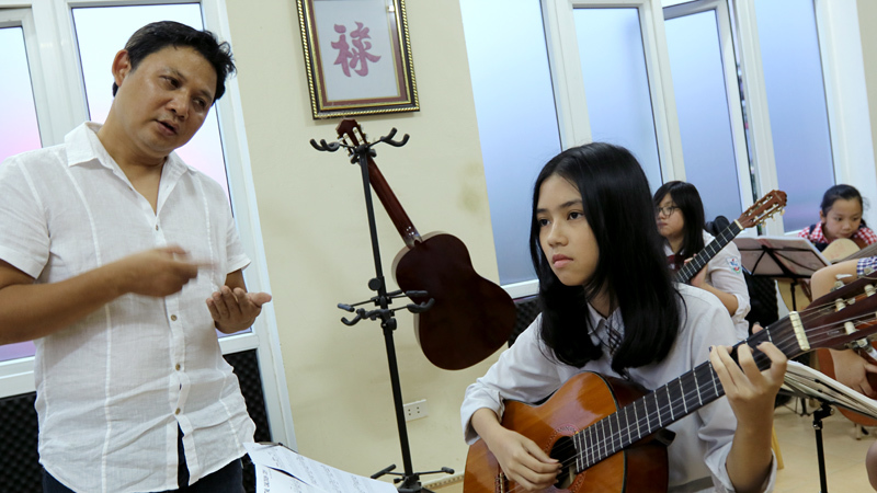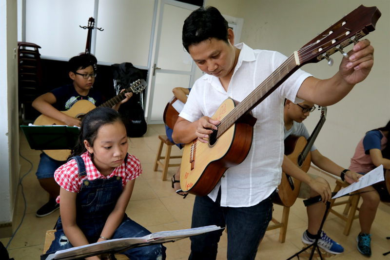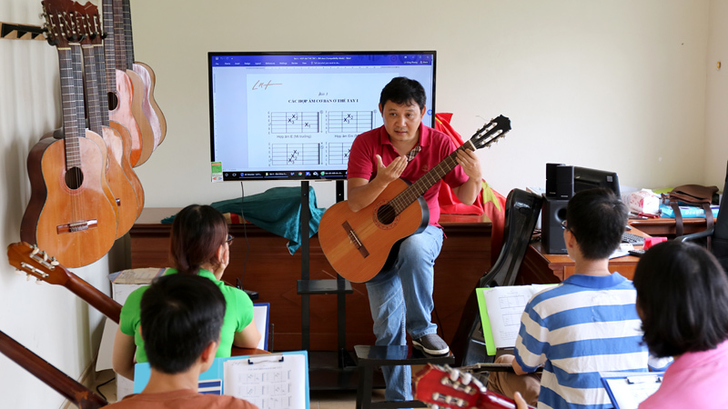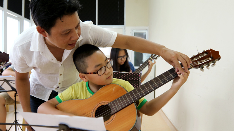 Thầy Lê Hùng Phong đang hướng dẫn lên dây đàn.