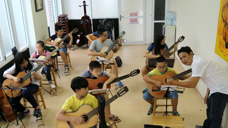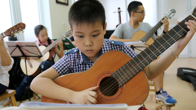 Trần Chí Kiên (9 tuổi) theo lớp guitar mới từ tháng 2/2017, đến nay đã chơi khá thành thục 10 bài.