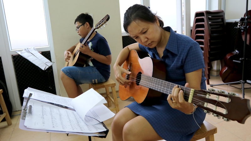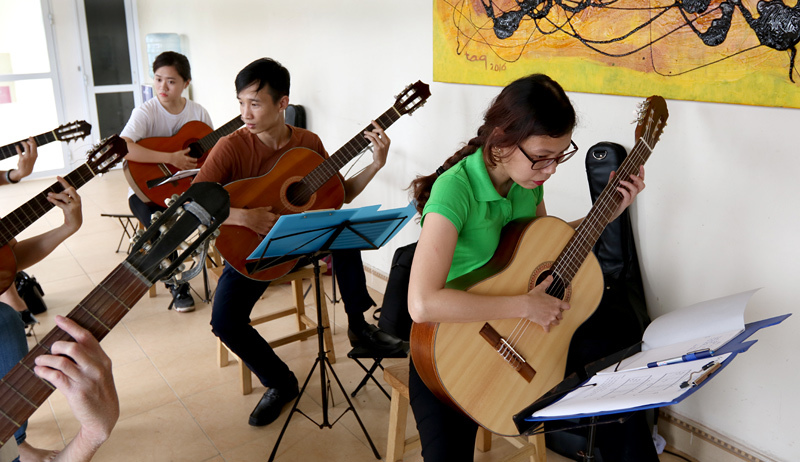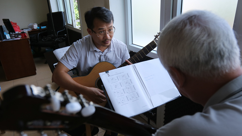 Anh Nguyễn Chiến Thắng (38 tuổi, cán bộ công tác tại UBND TP Hà Nội lần đầu tiên học guitar trao đổi học hỏi thêm bác Thụ trong một giờ học guitar.