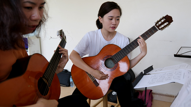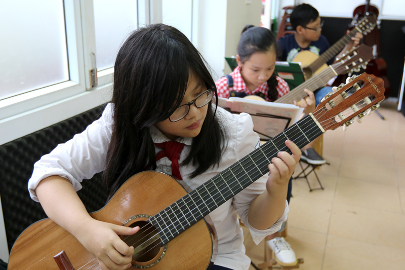 Minh Anh, (14 tuổi) nhà ở phố Đội Cấn theo học từ tháng 7/2016, đã đệm được thành thạo nhiều ca khúc, hiện nay em đang học cổ điển.