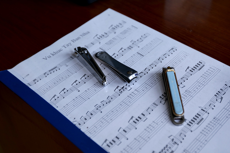 Thầy Phong lúc nào cũng chuẩn bị sẵn vài cái bấm móng tay để học viên cắt móng tay. Thầy Phong cho biết, những ngón bấm mà dài thì rất khó và thậm chí nếu đà quá không thể chơi đàn được nên lúc nào cũng phải có sẵn dụng cụ cắt móng tay ở lớp học.