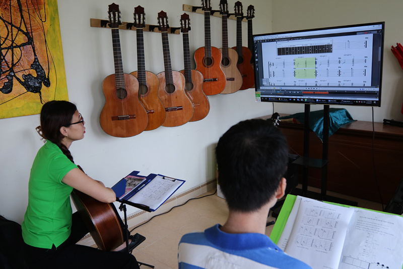 Với phần mềm GuitarPro, các ngón tay được mã hóa bằng các con số, được trình bày mạch lạc, dễ hiểu nên thời gian học đã rút ngắn đi rất nhiều. Chị Hà (43t) nhà ở phố Ngọc Khánh cùng 2 con theo học từ tháng 6/2016 cho biết do thích học guitar từ thời trẻ nhưng do điều kiện cộng với việc học guitar thời trước rất khó, phải rất khổ luyện nên nhờ có phương pháp giảng dạy mới này chị mới có hứng học đàn. Hai con chị Hà cũng theo mẹ học tại lớp đã một năm nay.