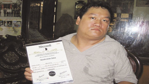 | Anh Thắng và bằng Microsoft có chữ ký của ông Bill Gates (Ảnh: Tiền Phong) |