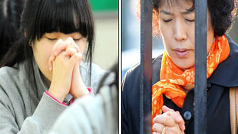 Thi đại học ở Hàn Quốc là một điều vô cùng khó khăn, thế nên trong phòng thi các thí sinh luôn nhắm mắt và cầu nguyện may mắn thì ở ngoài cổng, các bậc phụ huynh cũng căng thẳng không kém (Ảnh:Korea Times )
