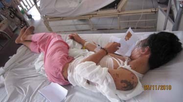 Äang nằm Ä‘au đớn tại bệnh viện, Phúc kể thêm, gần đây trong má»™t lần trên đưá»ng đến trưá»ng, Phúc bị má»™t nhóm khoảng 5 thanh thiếu niên Ä‘i trên 2 xe gắn máy xông đến để Ä‘e doạ bằng cách chá»i bá»›i và láºt bảng tên trước ngá»±c để xem tên rồi bá» Ä‘i.