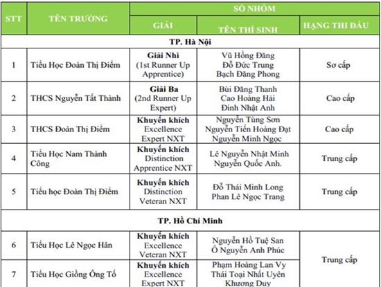 Cụ thể, tại cuộc thi Robotics quốc tế năm nay, đoàn học sinh Việt Nam đã đạt 7 giải. Đội tuyển trường Tiểu học Đoàn Thị Điểm (Hà Nội) gồm 3 em học sinh Vũ Hồng Đăng, Đỗ Đức Trung và Bạch Đăng Phong đã mang về cho đoàn Việt Nam giải Nhì hạng Sơ cấp. Đội tuyển trường THCS Nguyễn Tất Thành cũng của Hà Nội giành giải Ba hạng Cao cấp. Bên cạnh đó, đoàn học sinh Việt Nam còn đạt 3 giải DISTINCTION (Tiểu học Nam Thành Công, Tiểu học Đoàn Thị Điểm và Tiểu học Giồng Ông Tố) và 2 giải EXCELLENCE (THCS Đoàn Thị Điểm và Tiểu học Lê Ngọc Hân).
