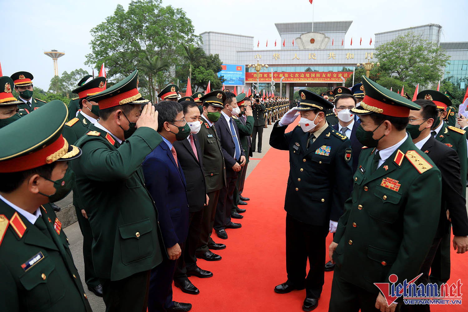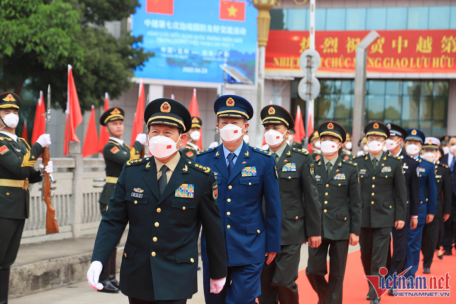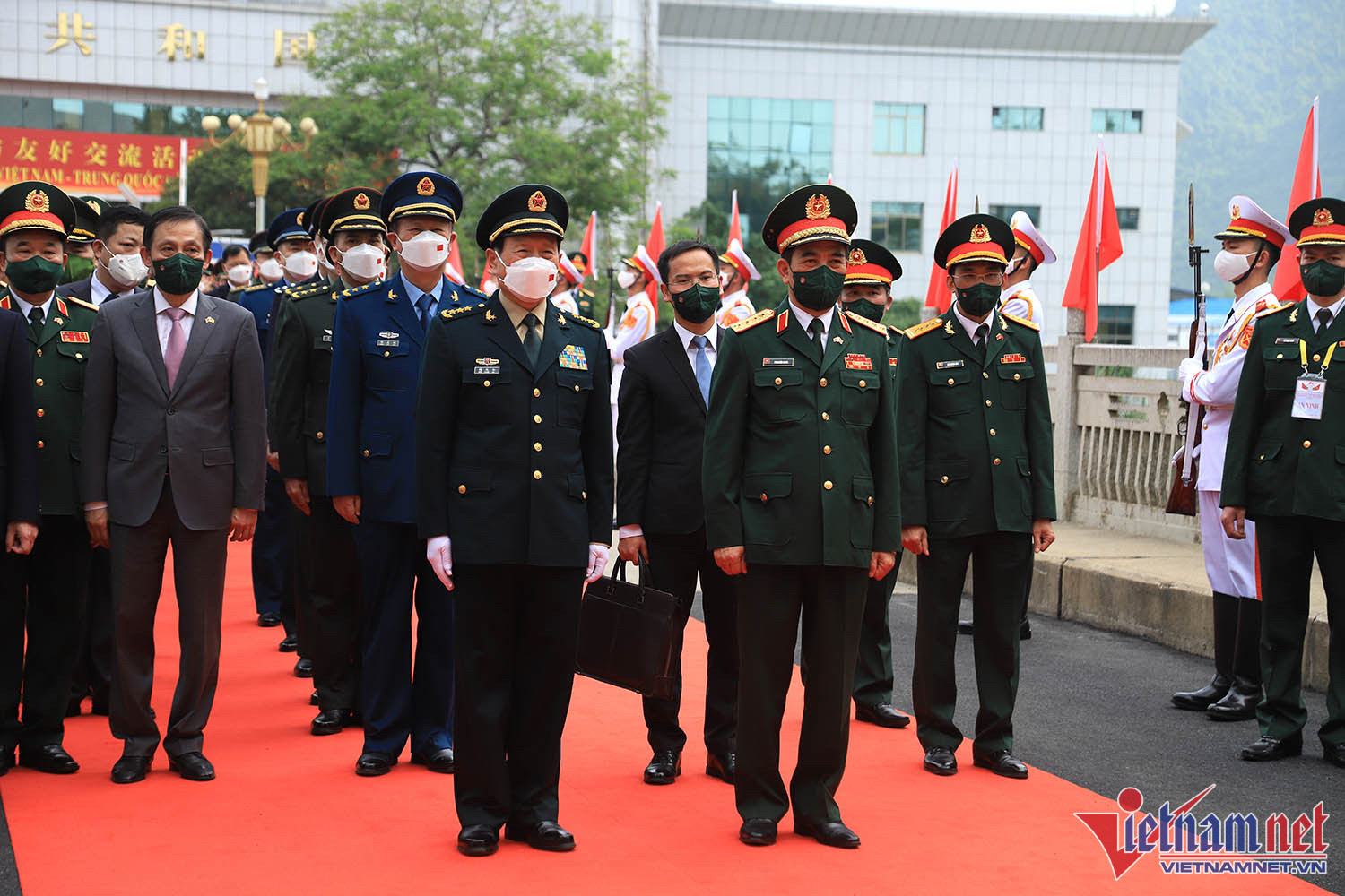 Trong tiếng nhạc hùng tráng từ cửa khẩu biên giới hai nước, Bộ trưởng Quốc phòng Phan Văn Giang nồng nhiệt chào đón đoàn đại biểu Bộ Quốc phòng Trung Quốc sang thăm.