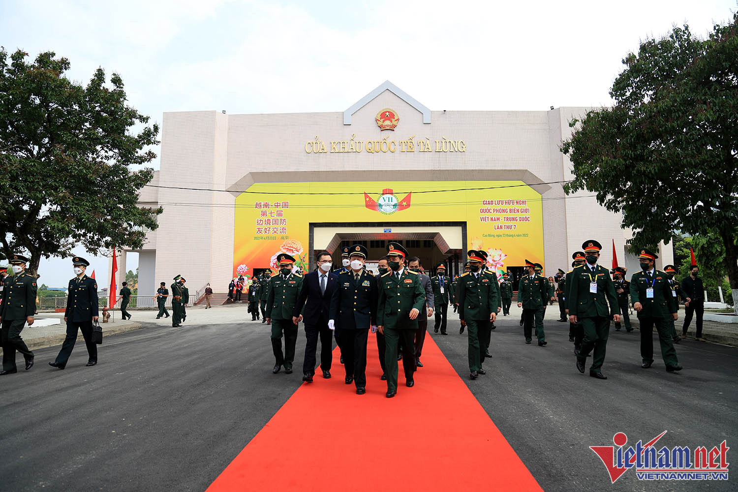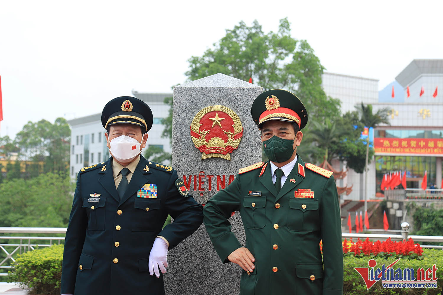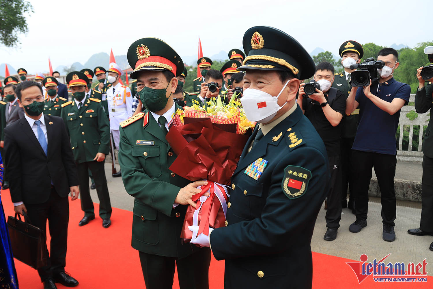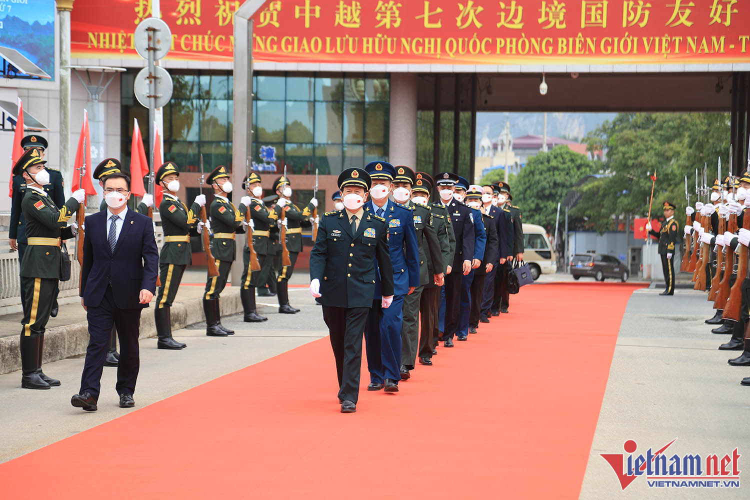 Trong tiếng nhạc hùng tráng từ cửa khẩu biên giới hai nước, Bộ trưởng Quốc phòng Phan Văn Giang nồng nhiệt chào đón đoàn đại biểu Bộ Quốc phòng Trung Quốc sang thăm.