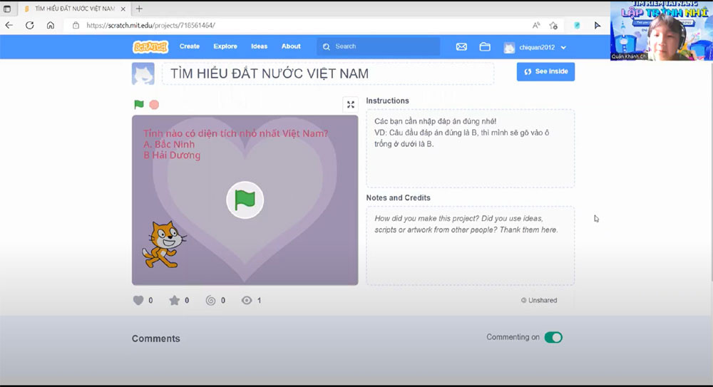 “Con đã hoàn thành xuất sắc các bài tập lập trình trên CodeCombat. Đặc biệt, Nhật Huy đã lập trình ra sản phẩm rất thú vị và hóc búa, là sản phẩm tốt trong lớp. Con biết kết hợp và tính toán chính xác các chướng ngại vật để người chơi phải suy nghĩ và nhanh tay mới có thể đến đích được”, giáo viên khóa học lập trình của Nhật Huy chia sẻ.