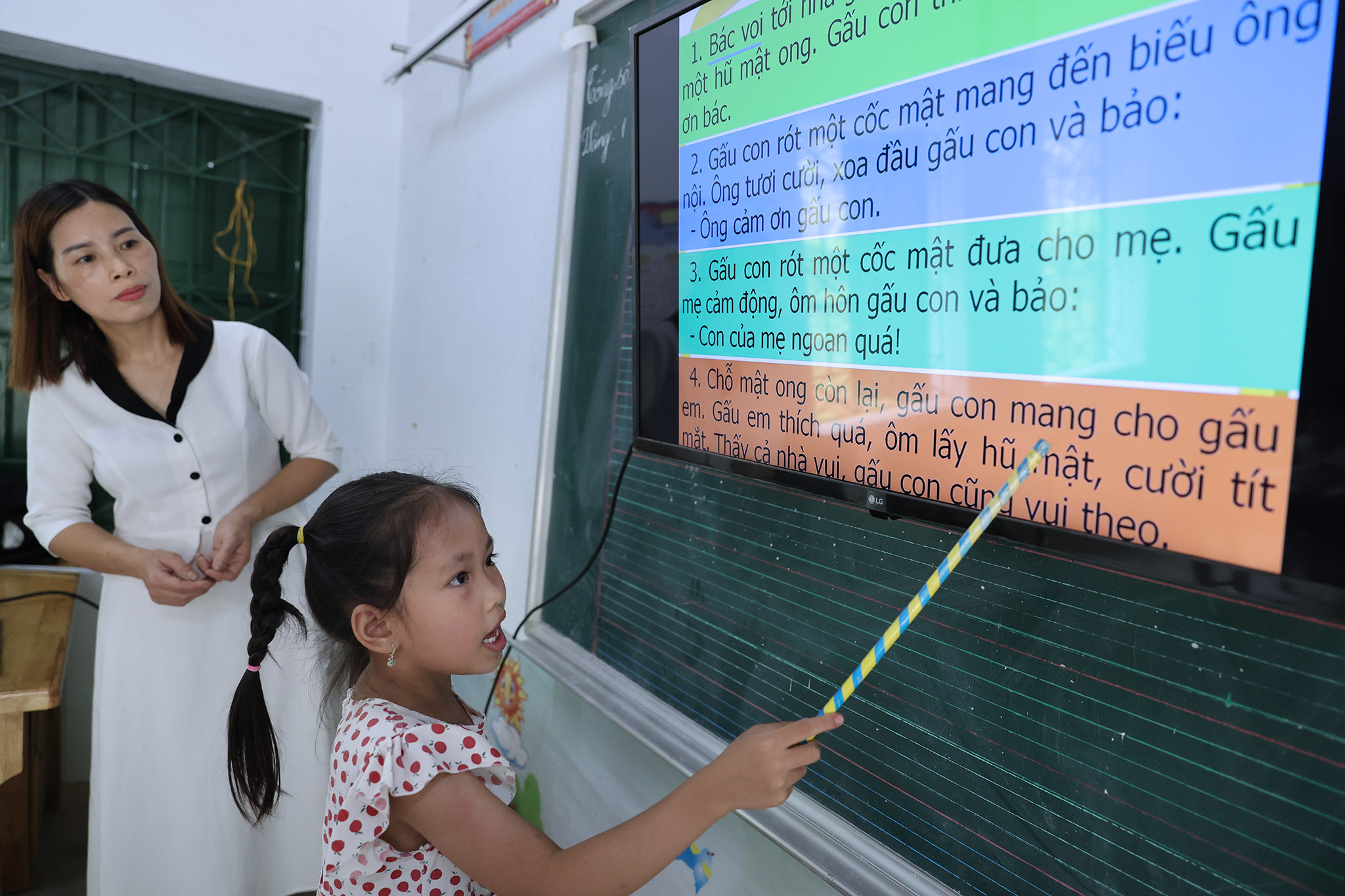 Có thể nói, giáo dục là lĩnh vực đặc biệt quan tâm và đi đầu trong việc ứng dụng CNTT vào các hoạt động chính. Đã 2 năm nay, chương trình giáo dục mới đã được áp dụng tại lớp 1 và lớp 3 điểm trường Bản Lài.Cô giáo Sằn Thị Nhẫn đã đồng hành 2 năm cùng các học sinh lớp 1 tại điểm trường Bản Lài với những bài giảng môn Tiếng Việt được lập trình sẵn trên laptop được trình chiếu trên màn hình tivi.Những bài học trình chiếu với những hình ảnh minh họa sinh động, đầy màu sắc khiến các học trò nhỏ hứng thú với học tập hơn.Không chỉ hình ảnh, những đoạn video minh họa có tính tương tác cao hơn, trực quan hơn và dễ hiểu hơn.Theo cô giáo Sằn Thị Nhẫn: Kỹ thuật dạy học ứng dụng CNTT rèn luyện năng lực, phẩm chất cho học sinh tốt hơn, sự tự tin, tương tác giữa người dạy, người học tốt hơn nhiều. Quá trình chuyển đổi số trong ngành giáo dục là yếu tố quan trọng, không chỉ với ngành mà còn ảnh hưởng lớn đến xã hội cả trước mắt lẫn lâu dài.Cô trò nhỏ Nông Hà My rất hứng thú với những bài học được trình chiếu qua màn hình tivi.Hiện nay, điểm trường Bản Lài có 5 lớp học thì có 3 lớp đã được trang bị màn hình tivi.Cô giáo Sằn Thị Nhẫn cho biết: Từ khi có chương trình mới giáo viên dạy đỡ vất vả hơn, học sinh cũng hứng thú học bài hơn.Bằng những hình ảnh, video hấp dẫn, sinh động, những bài học cuốn hút hơn, dần thắp nên niềm đam mê học tập trong những học trò đang ở độ tuổi ham khám phá. Không chỉ khiến học sinh đam mê với học tập hơn, những ứng dụng công nghệ mới vào việc dạy và học cuốn hút học sinh đến trường khiến "Mỗi ngày đến trường là một ngày vui" đúng như những tiêu chí mà thầy cô, học trò mong mỏi được nhắc nhở, ghi nhớ hằng ngày bằng những dòng khẩu hiệu hiện diện trong mỗi ngôi trường.Ông Trương Xuân Dũng, trưởng phòng giáo dục huyện Na Rì cho biết: Huyện Na Rì có 41 trường, 100% các điểm trường đều đã áp dụng phương pháp giảng dạy mới. Hiện nay các trường phổ thông thuộc huyện Na Rì đã thực hiện áp dụng phương pháp giảng dạy áp dụng CNTT tại lớp 3 và lớp 7, năm tới sẽ thực hiện ở lớp 4 và lớp 8 theo chương trình của Bộ GD&ĐT.