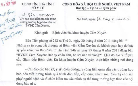 “Báo T.P ra ngày 30/8 có đăng bài: Những ca tử vong bất thường tại Bệnh viện Cẩm Xuyên: Do khách quan hay do bác sỹ yếu kém” và Báo điện tử Hà Tĩnh 24h ngày 29/8 có đăng bài: BVĐK Cẩm Xuyên: Bác sỹ chần chừ, trẻ sơ sinh tử vong”, trích nội dung công văn.