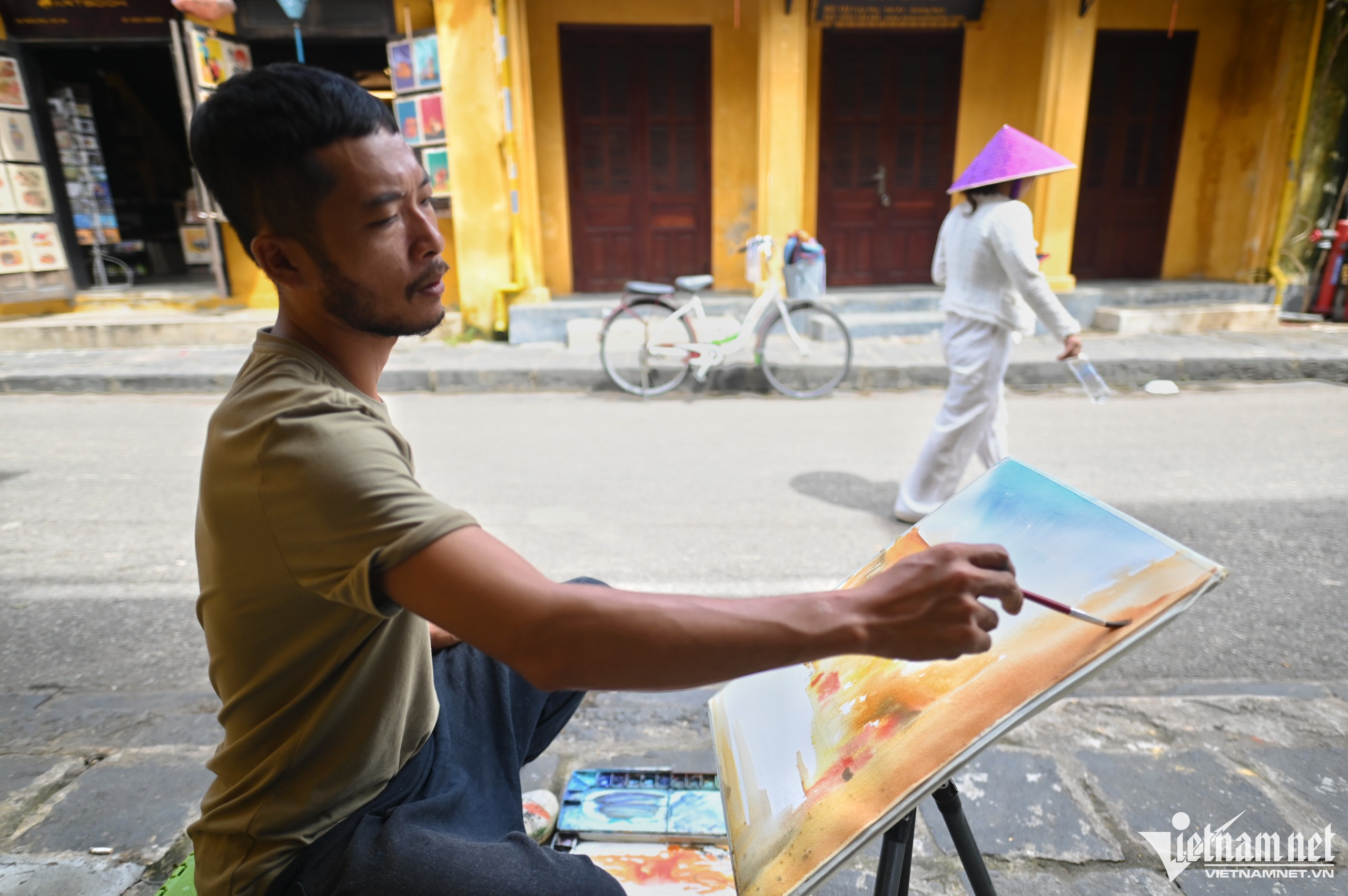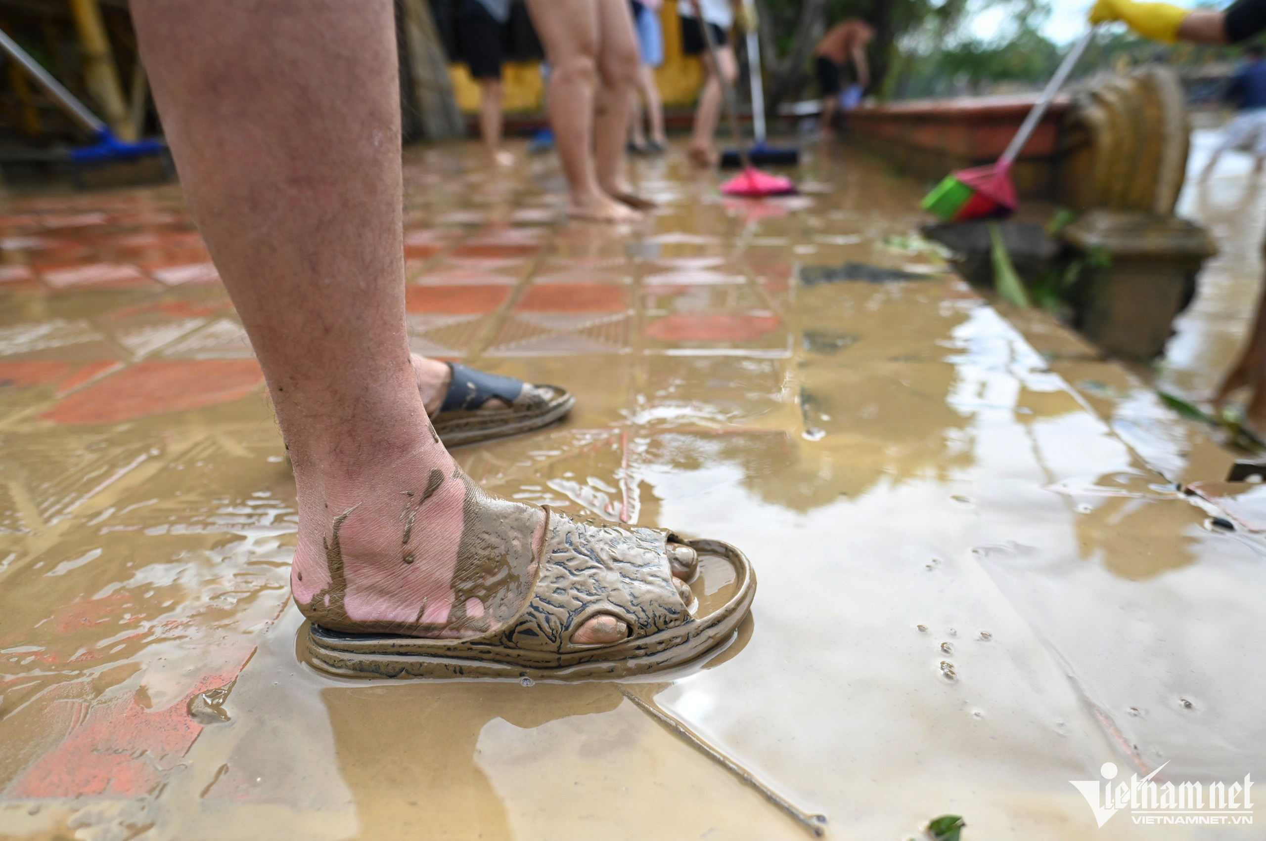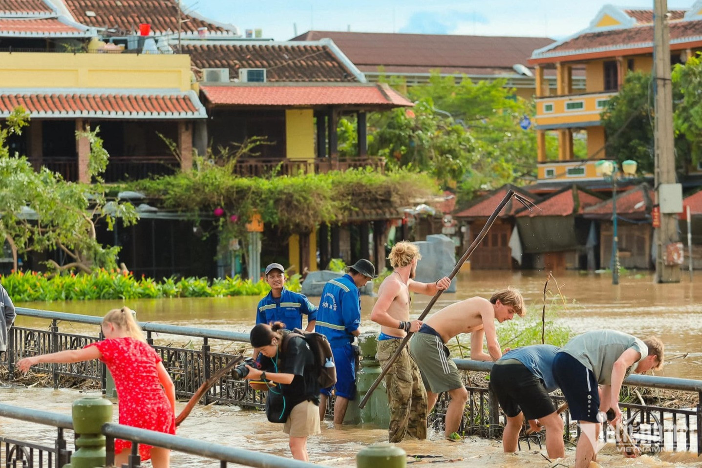 Sáng 29/8, nước sông Thu Bồn rút xuống, nắng lên, những con đường khô ráo trở lại, các tuyến đường ở phố cổ Hội An tuy thoát khỏi ngập nước nhưng bị ứ đọng nhiều bùn đất.Bạch Đằng là một trong những tuyến đường bị ngập nặng. Sáng nay, nơi đây khô ráo trở lại, rác thải trôi dạt đã được công nhân môi trường thu vun lại.Chợ Hội An đã nhộn nhịp trở lại sau một ngày vắng vẻ do tiểu tương ngừng kinh doanh buôn bán tránh bão.Hàng quán hai bên các tuyến đường đông đúc ngay từ sớm, như thể trước đó chưa có sự cố gì xảy ra.Anh Phan Văn Dưỡng múc nước sông Thu Bồn lau dọn nơi được gọi là "Không gian văn hoá Hội An ven sông". Nhiều khu vực tại thành phố Hội An vẫn ngổn ngang bùn đất, cây đổ, cành lá, rác thải ngập đường. Từ 4h, các tổ công nhân môi trường tiếp tục dọn dẹp sau một ngày làm việc không xuể. Nước rút, những tuyến đường bị ngập còn lại một lớp bùn trơn trượt khoảng 2-3cm. Công nhân môi trường vừa cào quét vừa dùng vòi nước công suất lớn phun rửa.Các gia đình bị hư hỏng nhà cửa do bão Noru rục rịch sửa sang khi nắng xuất hiện trở lại.Chị Sen( làm việc tại một tiệm đồ da trên đường Trần Phú, phường Minh Anh) dọn dẹp đồ đạc, chuẩn bị bày bán. “Hôm trước nước dâng mạnh, cửa hàng tôi thu vén đồ đạc lên cao. Cũng may nước chưa dềnh vào nhà nên không bị hư hỏng gì”, chị Sen nói.Sáng 29/9, nhiều du khách sau một ngày bị kẹt vì bão đã vội vã đi dạo ở các tuyến phố cổ. Một nhóm du khách trẻ từ Hải Phòng vào Hội An du lịch mừng vui vì nhiều nơi đã khô ráo để có thể tham quan các địa danh.Chị Lê Thị Linh Phương (đến từ Hải Phòng) chia sẻ: “May mắn khi vào tới nơi thì bão đã qua, ngập lụt cũng đã hết. Thời tiết rất tuyệt vời”.Chị Lưu Thị Mỹ Linh có chuyến du lịch dài ngày cùng gia đình. “Khi bão Noru đổ bộ tôi đang ở Đà Nẵng. Hôm nay cả nhà mới vào Hội An. Du lịch mùa bão cũng hơi xui nhưng đổi lại có được trải nghiệm đáng nhớ”, chị Linh nói.Phố phường Hội An sáng nay trở về cảnh yên ả, thanh bình.Những điểm tham quan nổi tiếng đông đúc từ khoảng 9h30 - 10h. Tại chùa Phước Kiến bên trong phố cổ Hội An, nhiều đoàn du khách quốc tế tổ chức ghé thăm. Các quán cà phê trong nhà, ngoài phố sáng nay đều kín chỗ.Anh Tú, họa sĩ tự do sinh sống và làm việc tại Hội An chia sẻ: “Nắng đẹp, tôi mang họa cụ ra phố vẽ tranh. Sống ở Hội An nhiều năm, chứng kiến nhiều lần thiên tai, tôi thấy năm nay vẫn rất may mắn vì người dân nơi đây không bị thiệt hại quá nặng nề”.Nhiều cặp đôi vui vẻ thể hiện tình cảm trên phố.