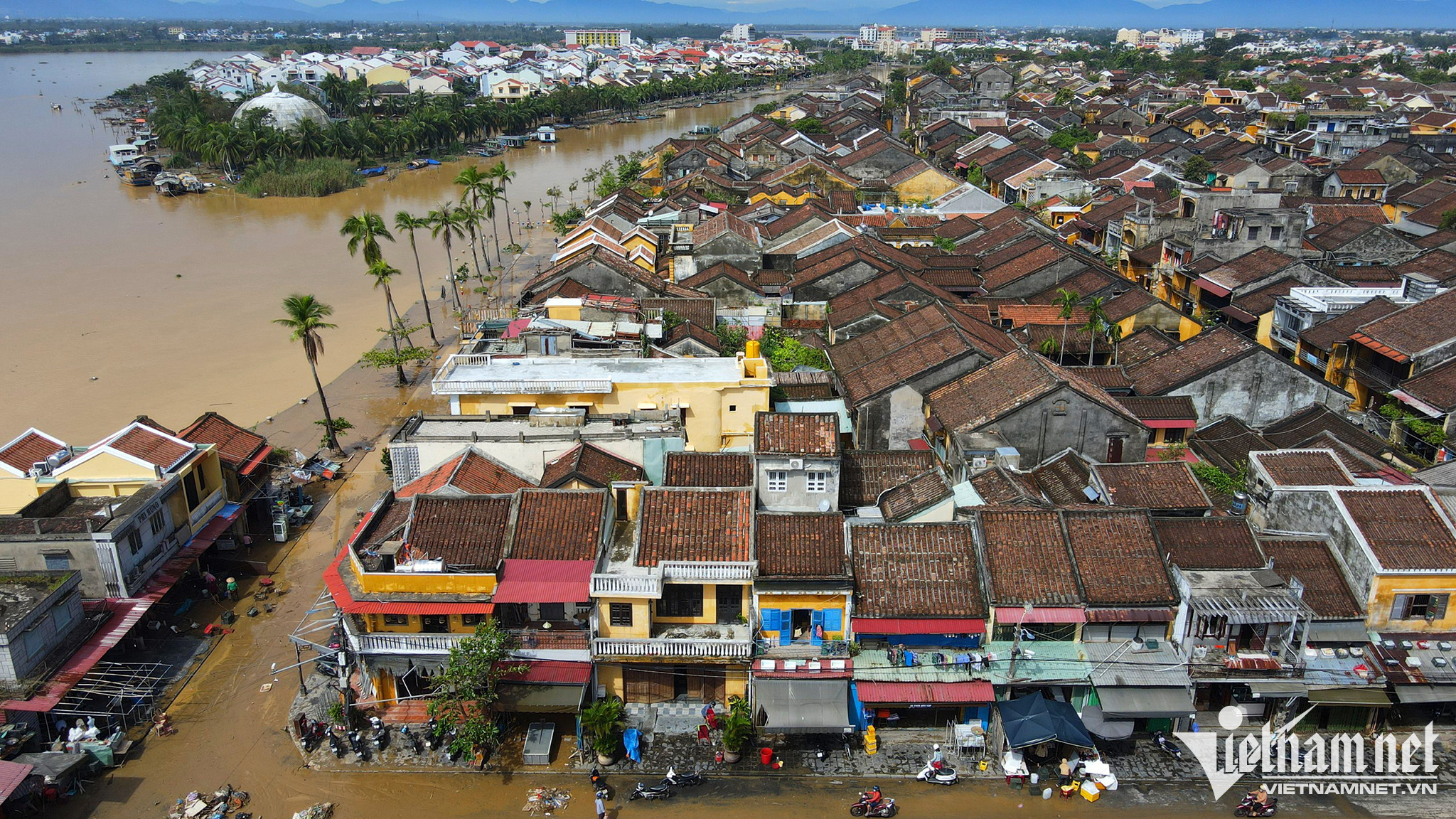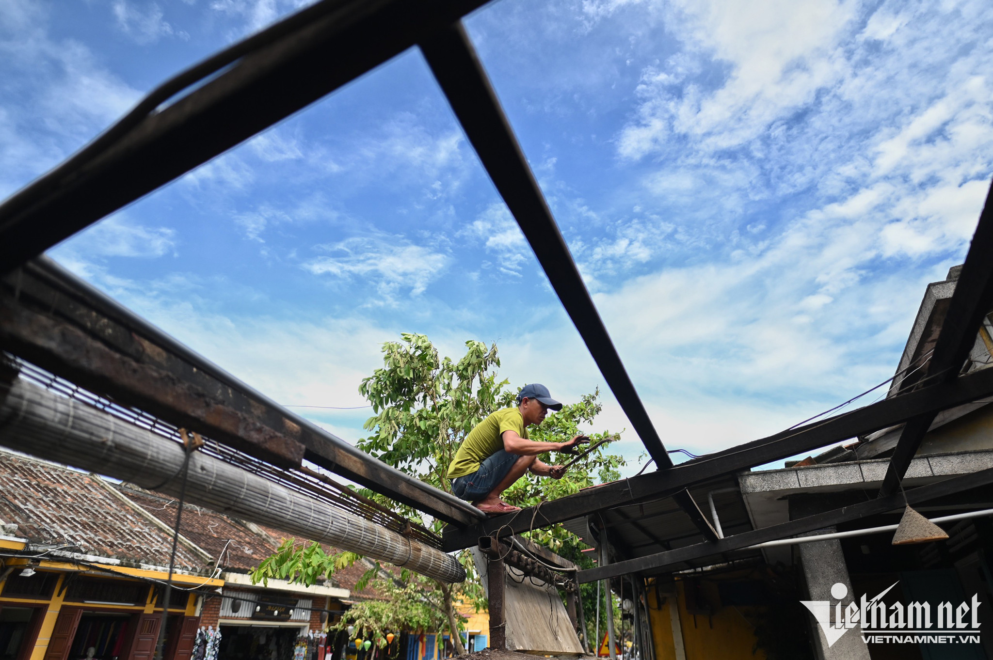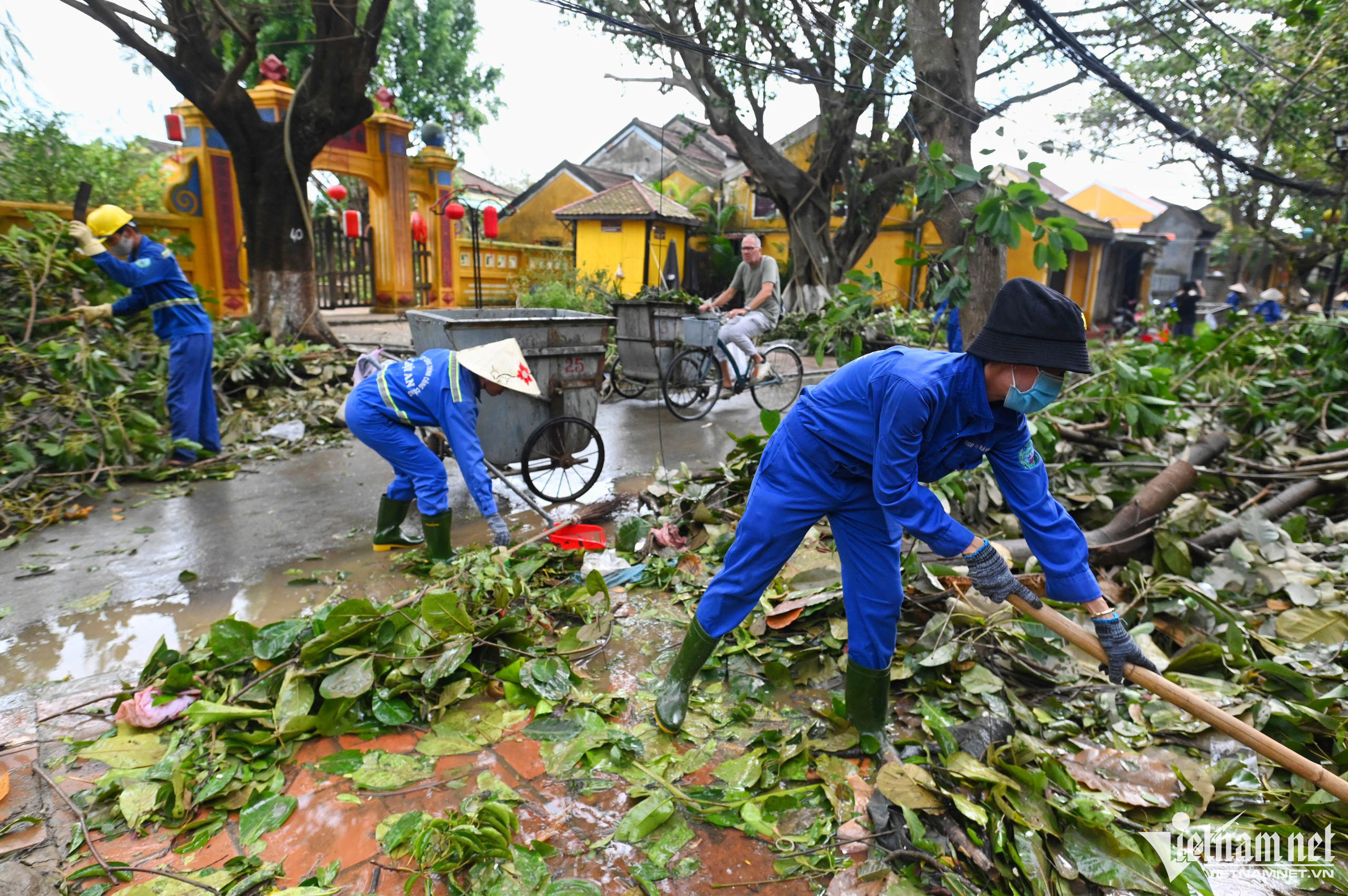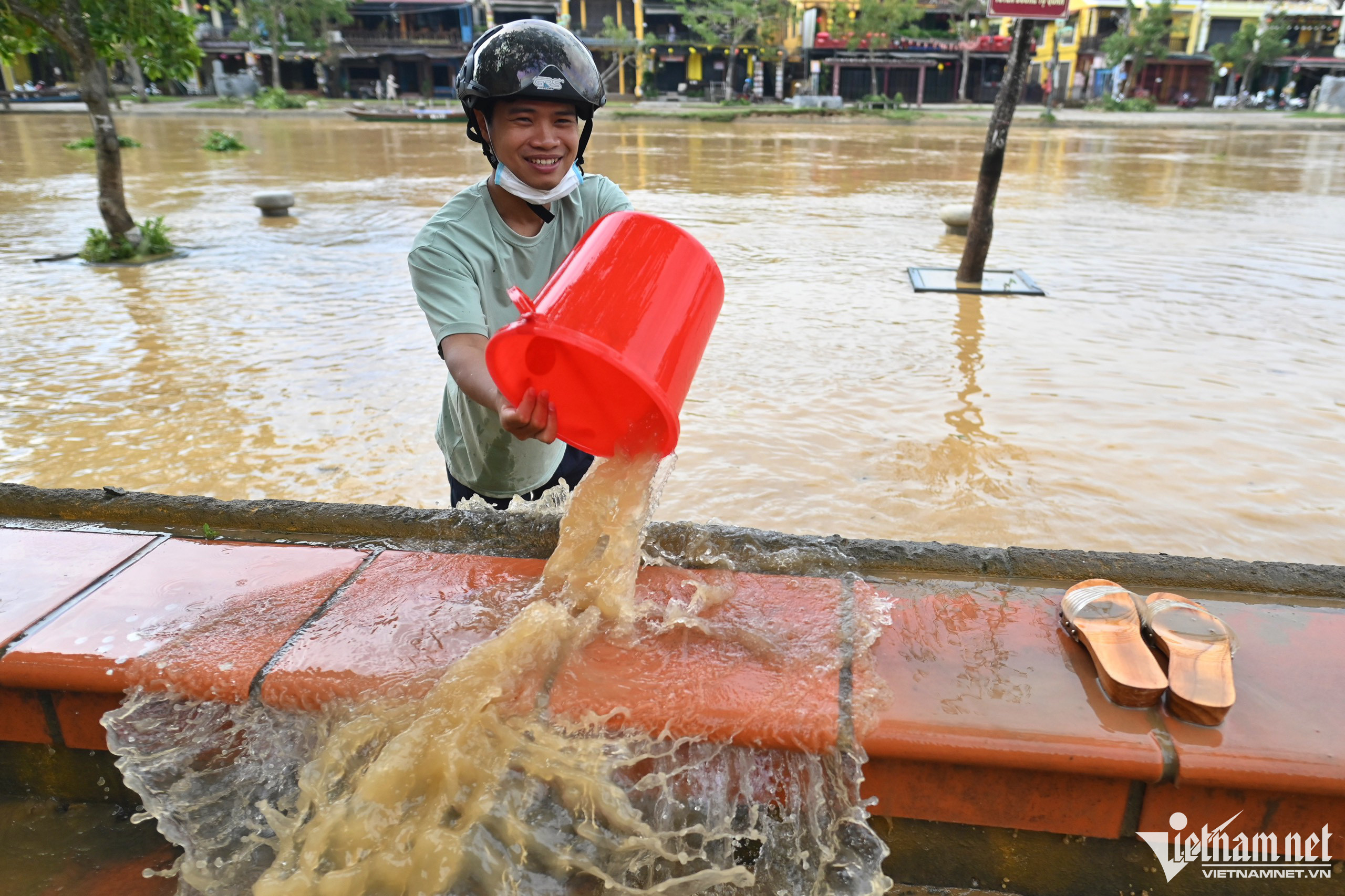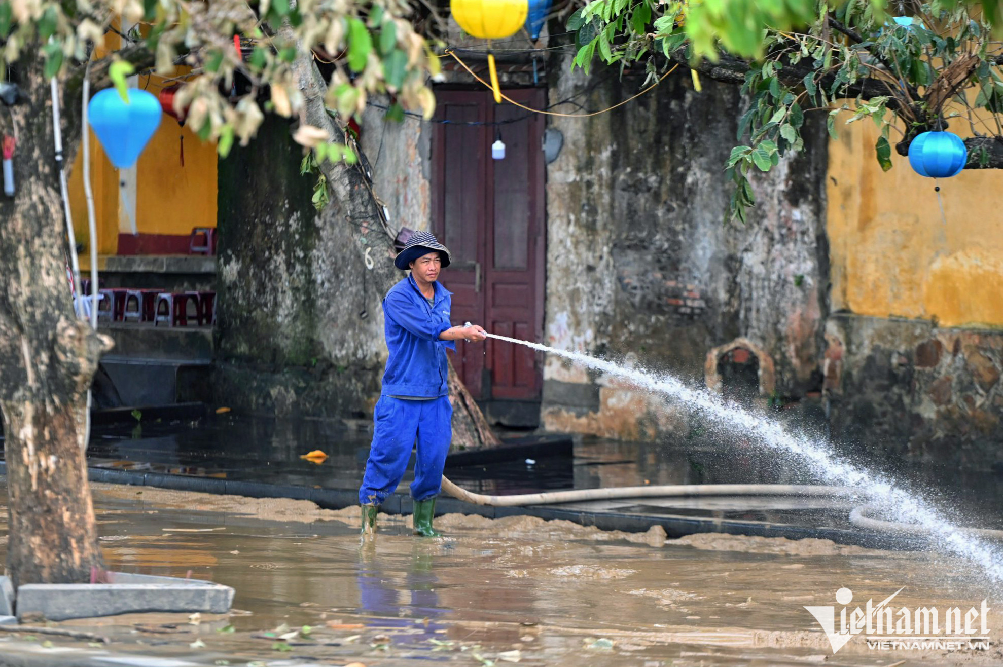 Sau khi nước rút, sáng 29/9, người dân ở phố cổ Hội An (Quảng Nam) bắt đầu bắt tay vào tát nước, dọn dẹp, sửa lại mái nhà bị tốc, công nhân môi trường cắt tỉa thu dọn cành cây, còn du khách vội vã dạo chơi phố cổ ngay từ sáng sớm.