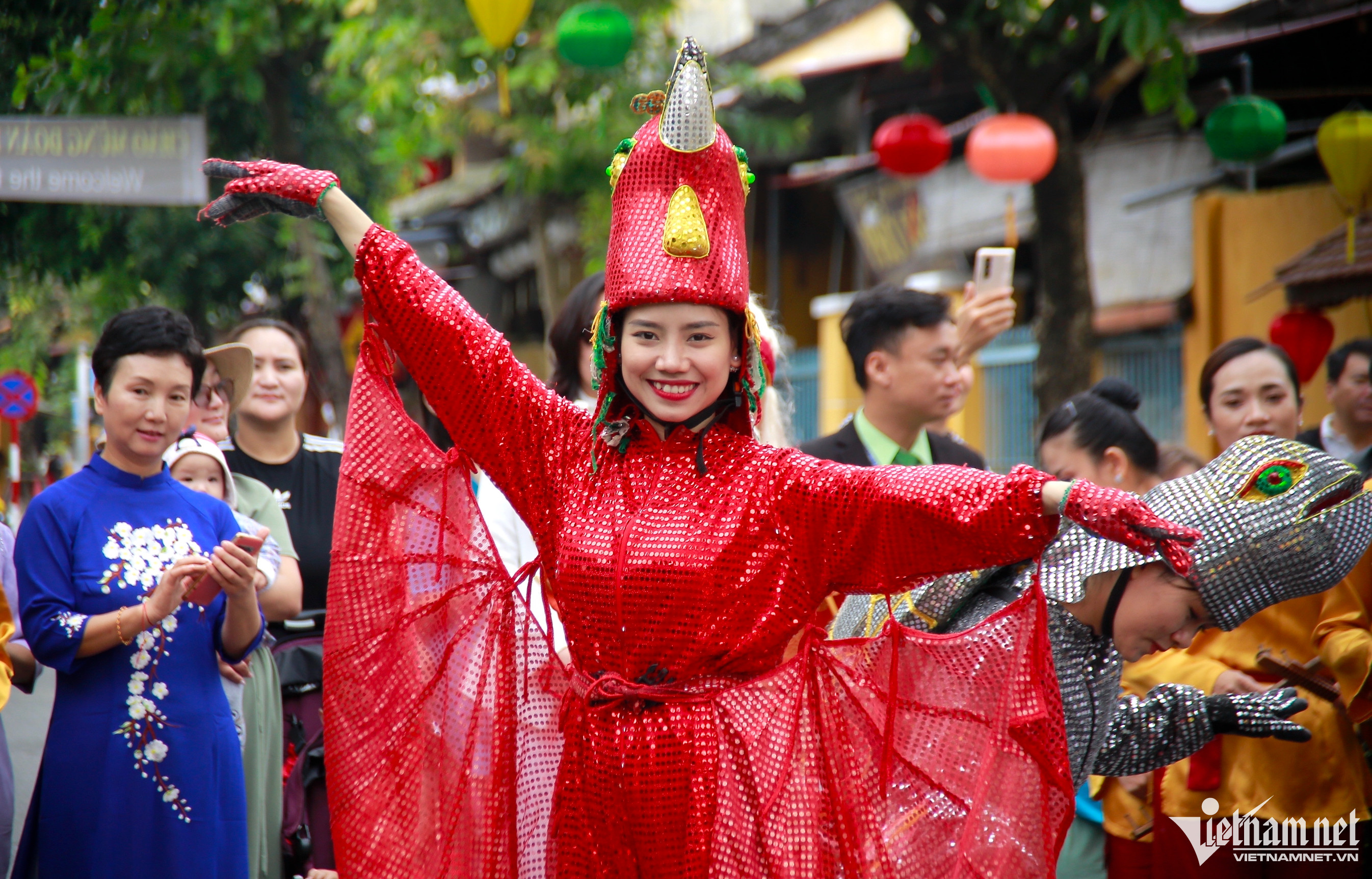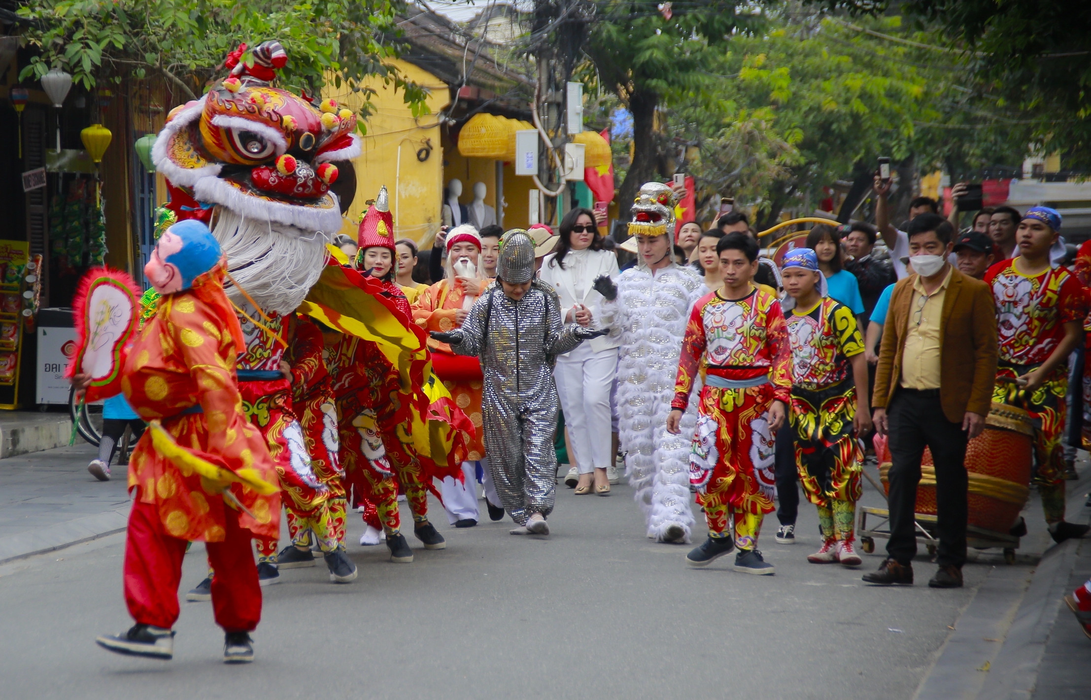 Đoàn khách được tiếp đón bằng đội hát múa sắc bùa, đội Thiên cẩu, Tứ Linh “Long, Lân, Quy, Phụng” từ ngã tư Phan Châu Trinh – Lê Lợi đến đình Hội An.