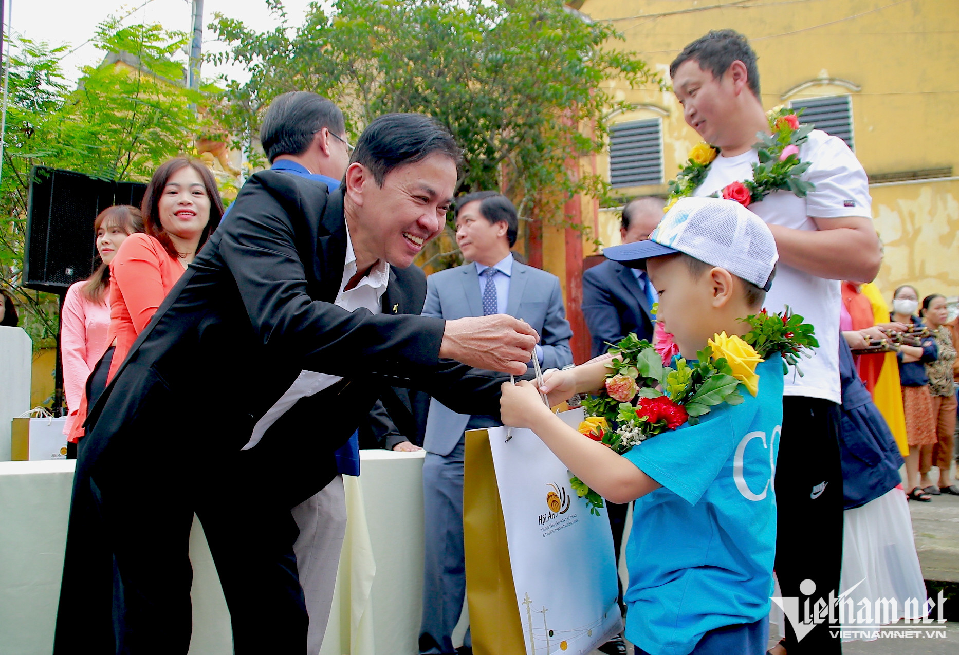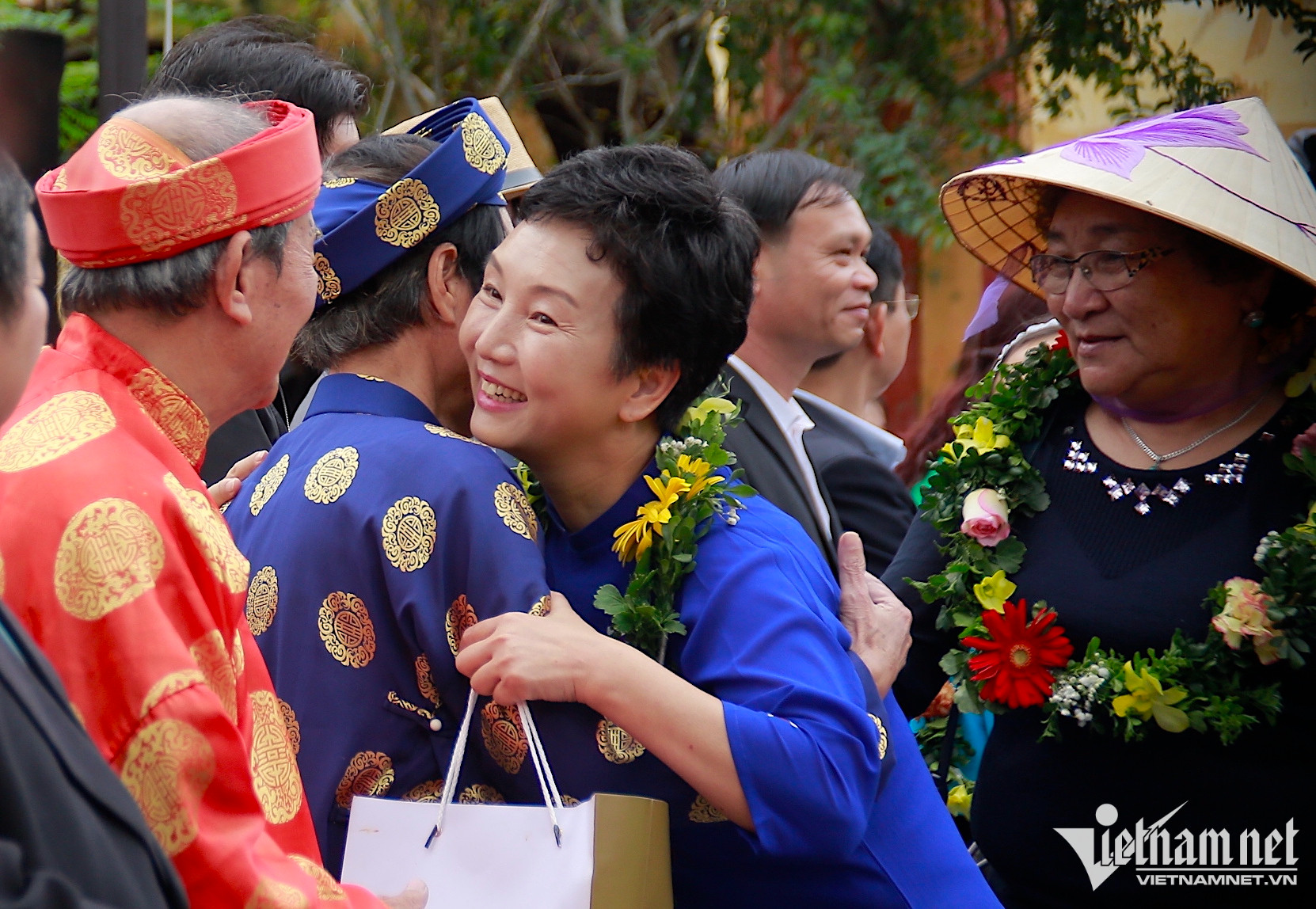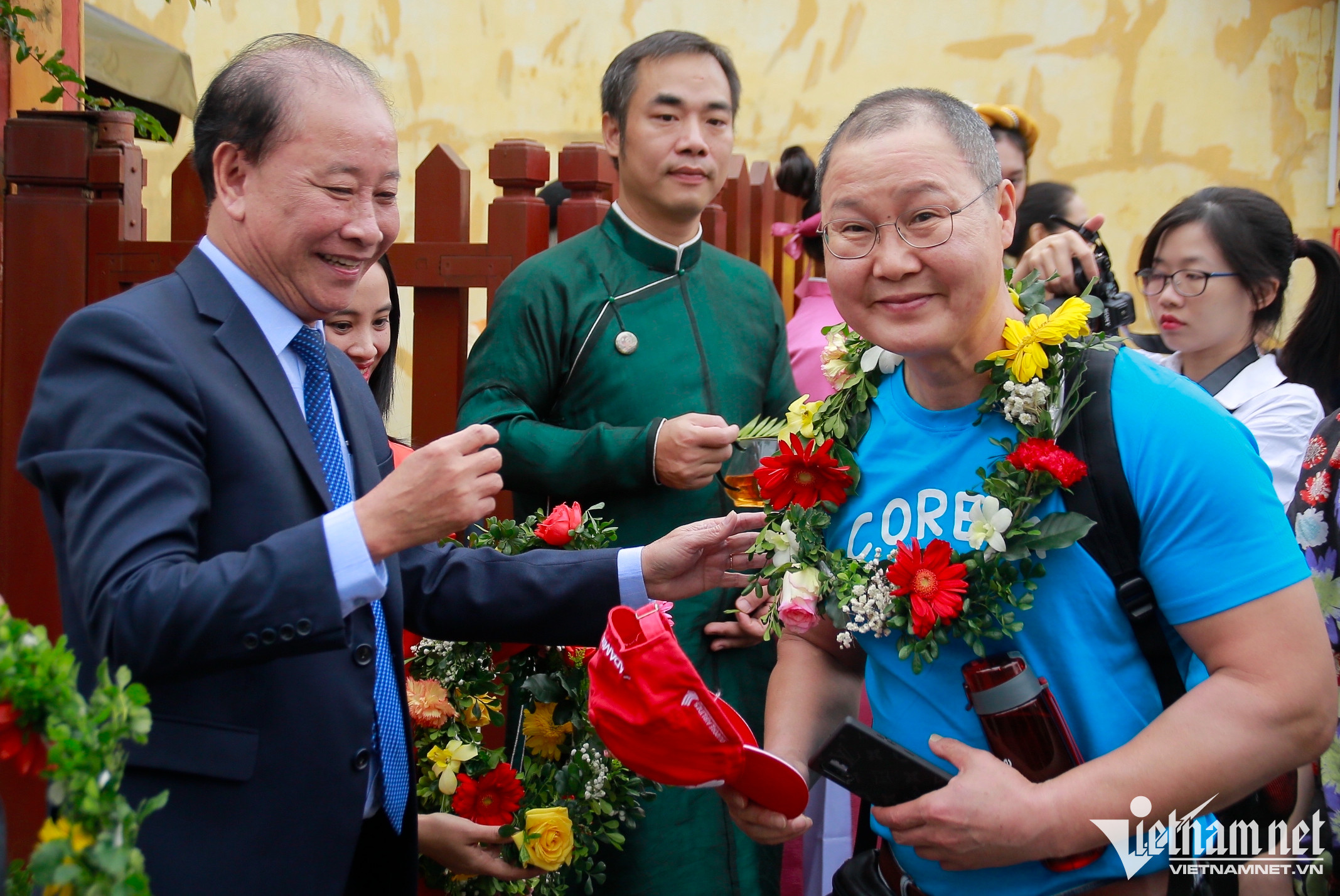 Tại đình Hội An, du khách được chính quyền tặng hoa, quà và thưởng thức trà. Chào đón đoàn khách tại đây là dàn trống hội đánh lên rộn rã.