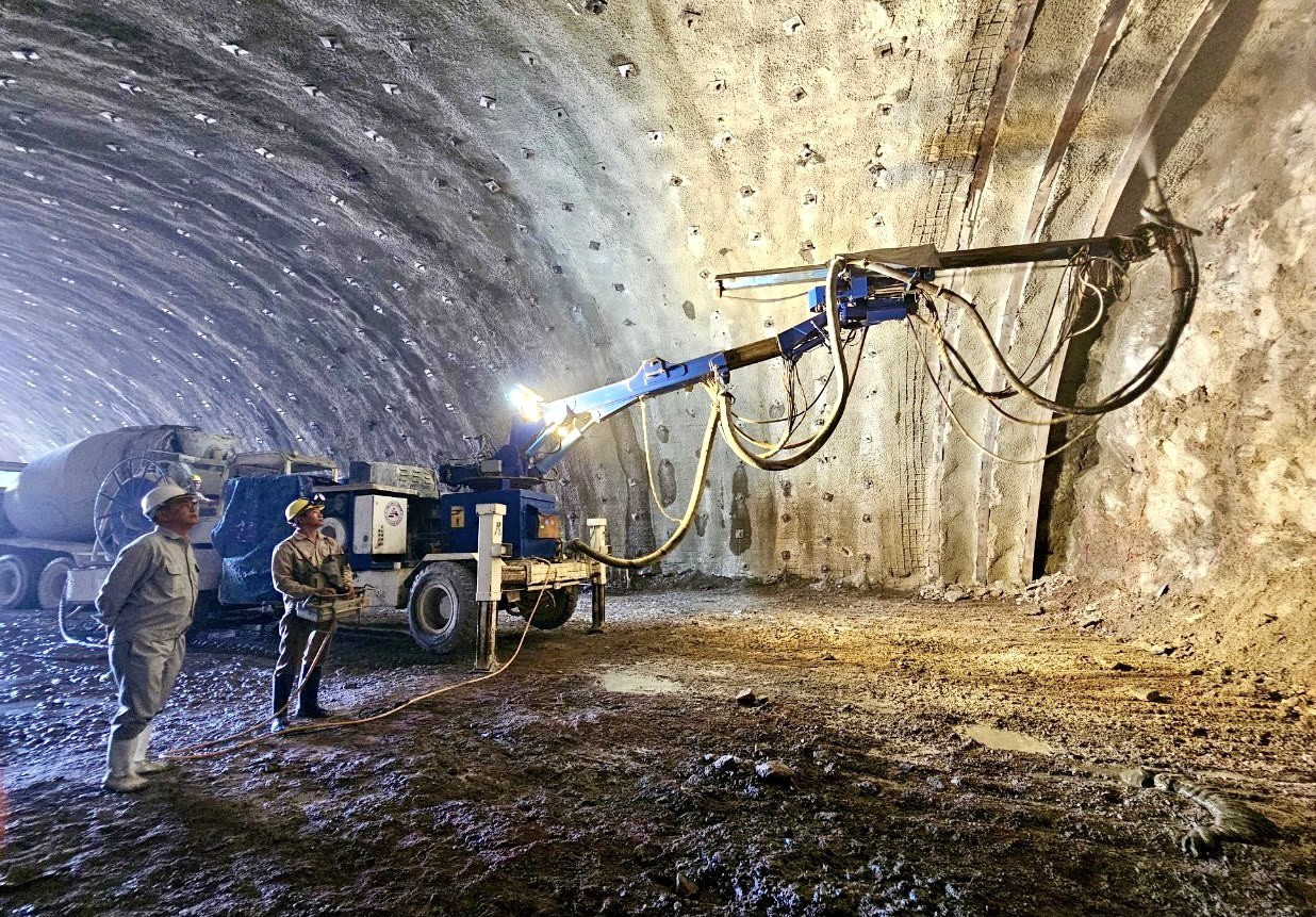 Tại ống hầm phải, đơn vị đang tổ chức dùng thiết bị khoan hầm để khoan tạo lỗ nổ mìn. Tại ống hầm trái, robot vẫn đang được điều khiển tích cực phun vẩy bê tông để gia cố hầm Sơn Triệu.