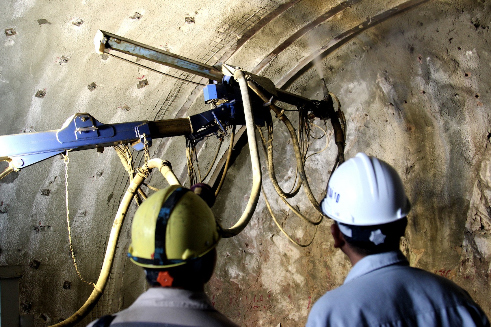 Tại ống hầm trái, robot vẫn đang được điều khiển tích cực phun vẩy bê tông để gia cố hầm Sơn Triệu (Ảnh: Diễm Phúc).