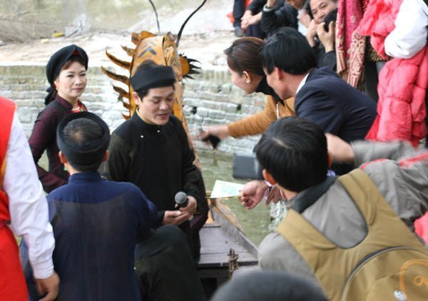 “Tiền chẳng đáng bao nhiêu. Họ biểu diễn phục vụ, mình quý nên muốn ủng hộ, vậy thôi. Đi vào tít sâu trong đình Lim để tìm hòm công đức thì xa, mà lại không... thân mật và tình cảm” - một khán giả vừa ném tiền vào thuyền, vừa trả lời TT&VH.