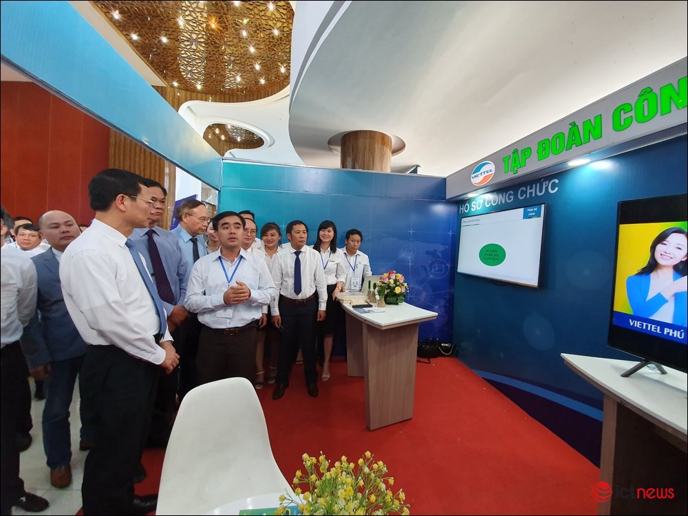 Bộ trưởng nghe trình bày ngắn về giải pháp chính phủ điện tử tại gian hàng của Tập đoàn công nghiệp viễn thông Quân đội (Viettel). |