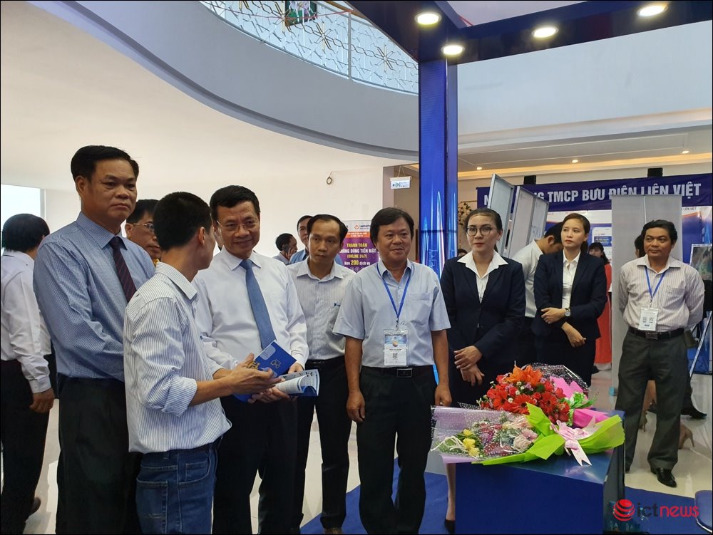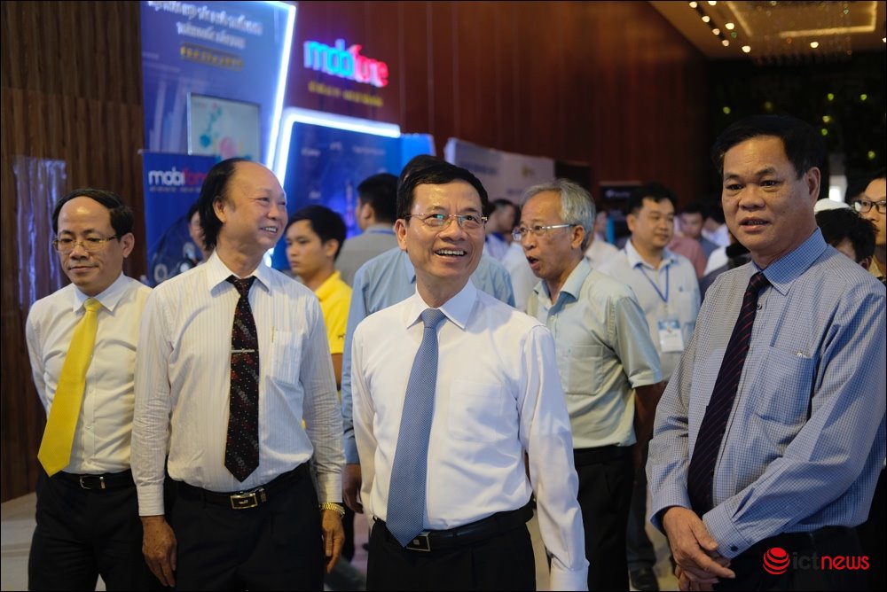 Bộ trưởng Bộ Thông tin & Truyền thông Nguyễn Mạnh Hùng (chính giữa) dẫn đoàn dại biểu là lãnh đạo tỉnh Phú Yên và đại diện các doanh nghiệp đi thăm các gian hàng tại hội thảo. |