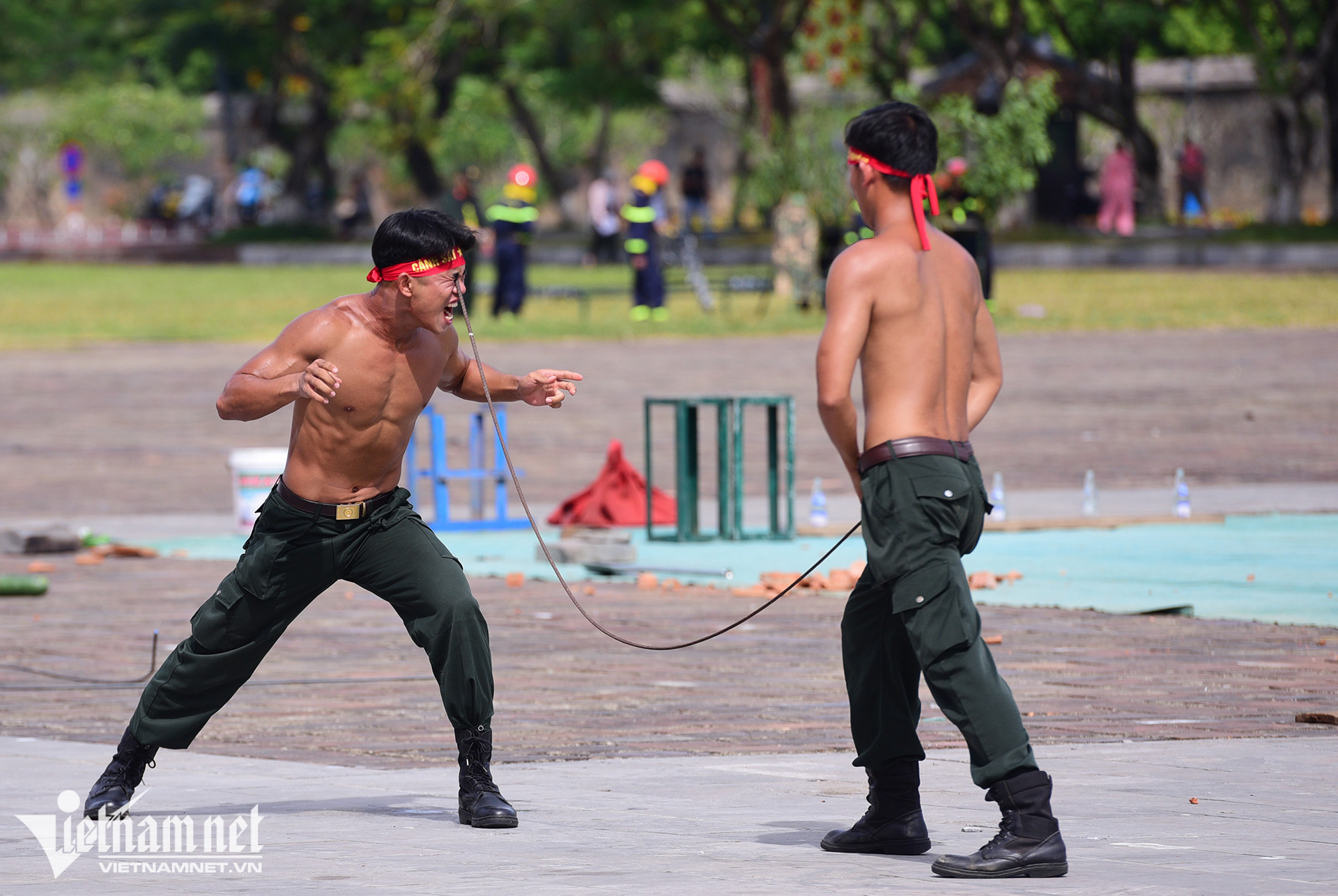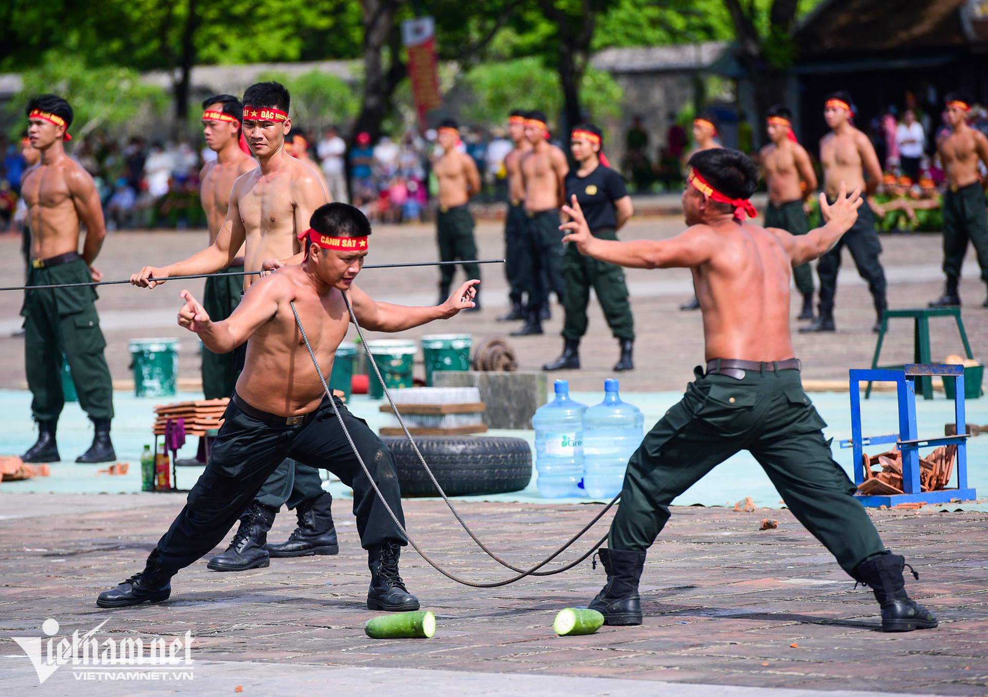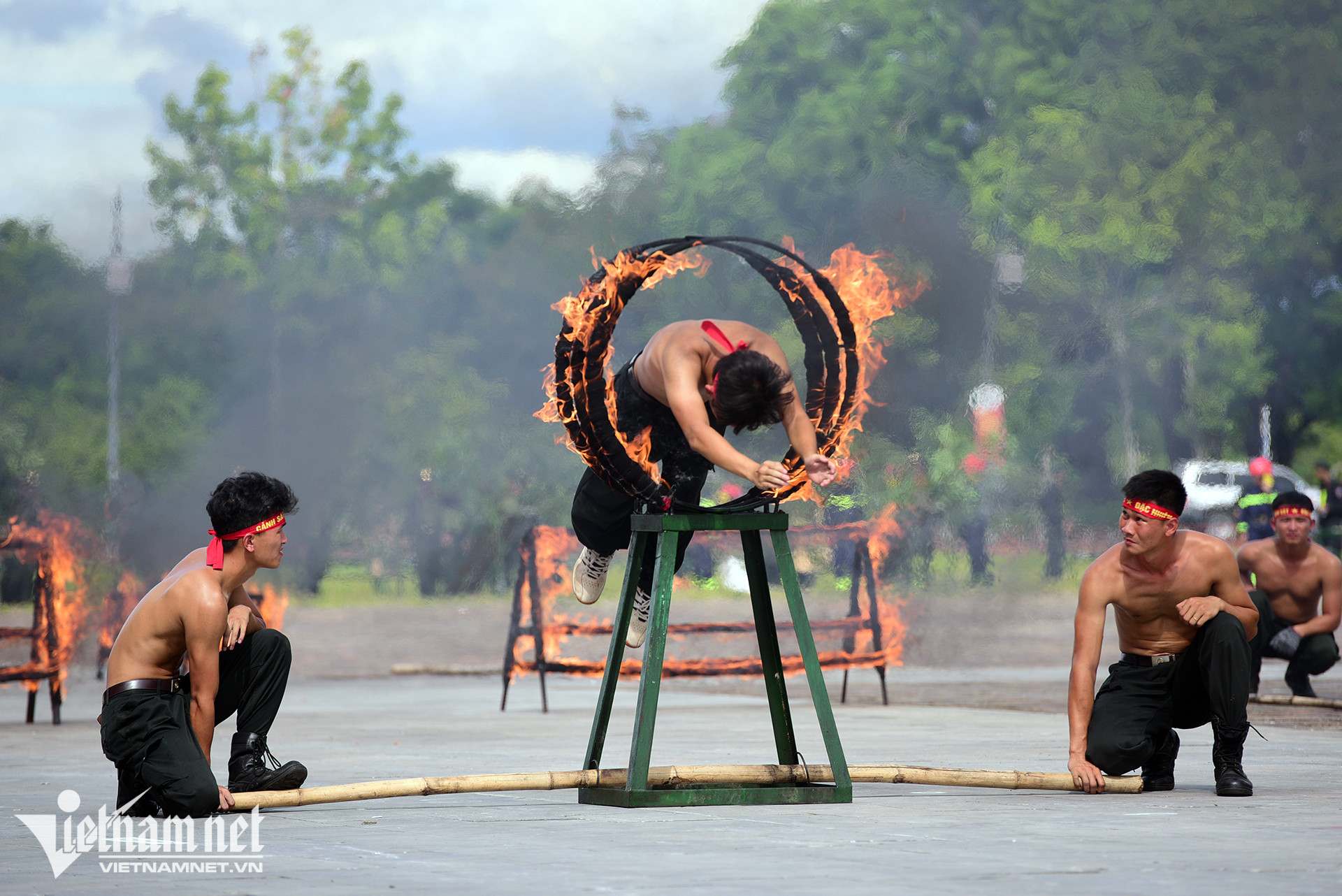Dùng mắt bẻ cong thanh sắt, mình trần nhảy qua vòng lửa là những hình ảnh ấn tượng tại hội thi điều lệnh, bắn súng, võ thuật công an nhân dân khu vực phía Nam, diễn ra sáng 4/7 ở Thừa Thiên-Huế.