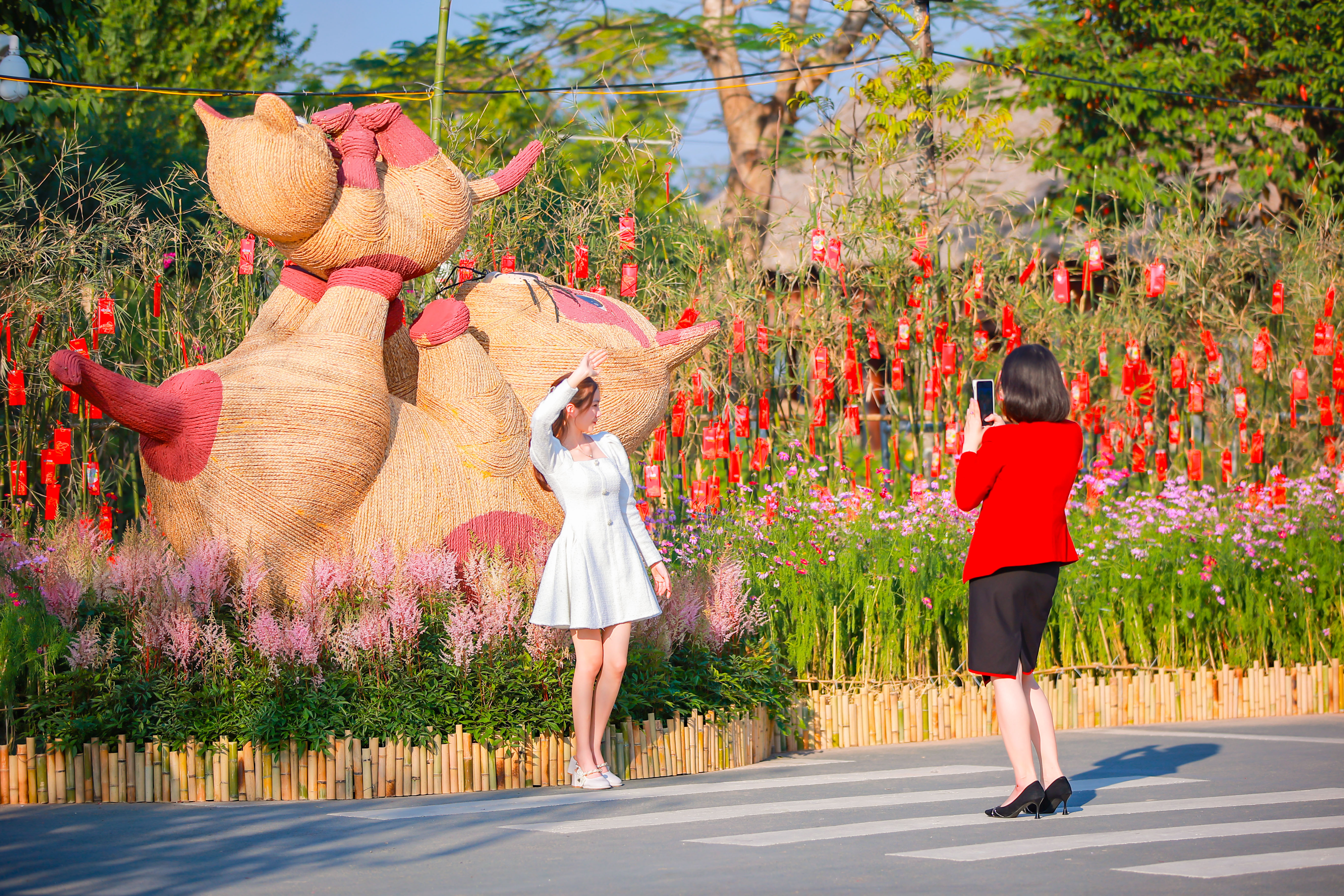 Loạt tiểu cảnh đặc biệt vừa là đặc trưng của Tết Việt cổ truyền vừa là biểu tượng của hiện đại và tương lai như 3 linh vật mèo An nhiên - Hạnh phúc - Sức khỏe, cây tài lộc ngập tràn điều may, phi thuyền… cũng là những “góc sống ảo” được giới trẻ lựa chọn.
