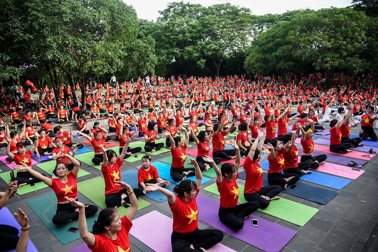 Festival Yoga diễn ra với tiết mục biểu diễn xếp hình Tháp Bút đẹp mắt đặc trưng của Thủ đô, màn đồng diễn Chào mặt trời, Yoga cười đầy mạnh khỏe và sảng khoái.