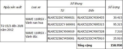 Lô xe WAVE 110 RSX 2012 nằm trong diện thay thế phụ tùng có chi tiết như sau: