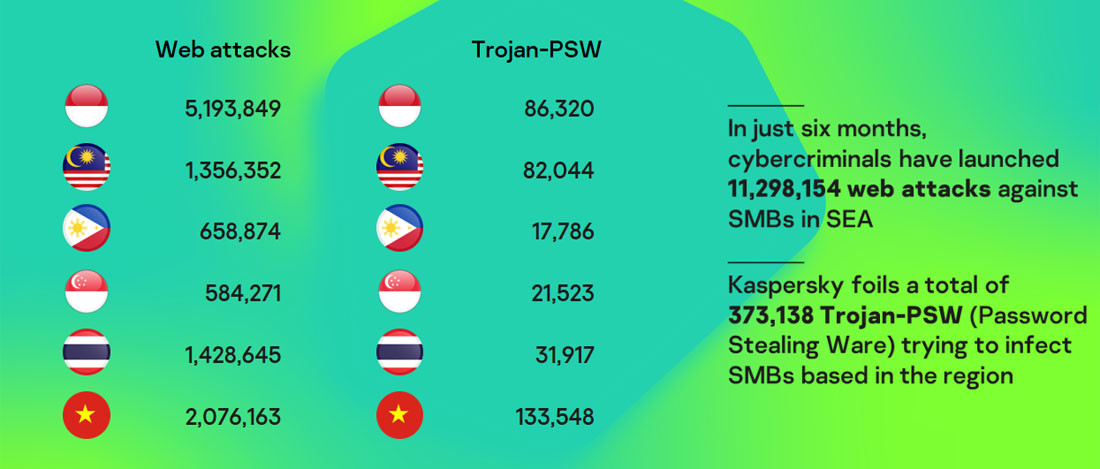 Bên cạnh mối đe dọa web, hãng bảo mật Kaspersky ghi nhận tổng cộng 373.138 trojan-PSW cố gắng xâm nhập vào hệ thống của các doanh nghiệp vừa và nhỏ trong khu vực ASEAN. Sáu tháng đầu năm nay, các nước ghi nhận nhiều sự cố nhất gồm Việt Nam, Indonesia và Malaysia.