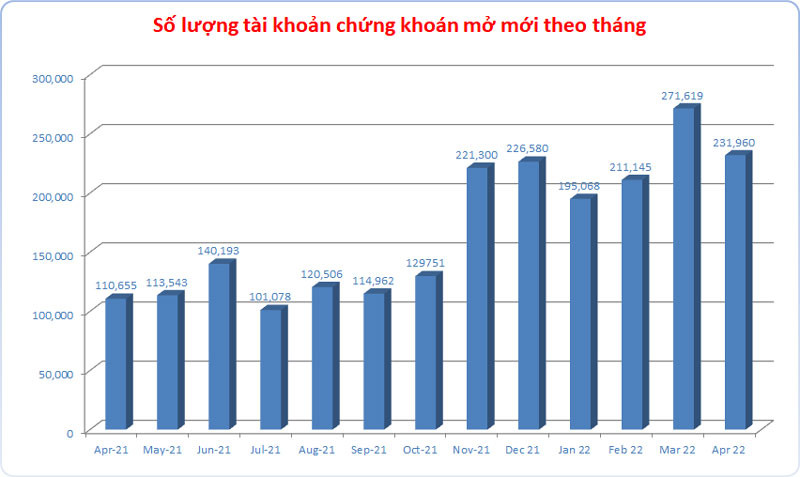 Số liệu từ Trung tâm lưu ký Chứng khoán Việt Nam (VSD) cho thấy, trong tháng 4, các nhà đầu tư trong nước đã mở mới 231.960 tài khoản chứng khoán, trong đó các nhà đầu tư cá nhân mở mới 231.782 tài khoản. Số lượng tài khoản do nhà đầu tư tổ chức mở là 178.