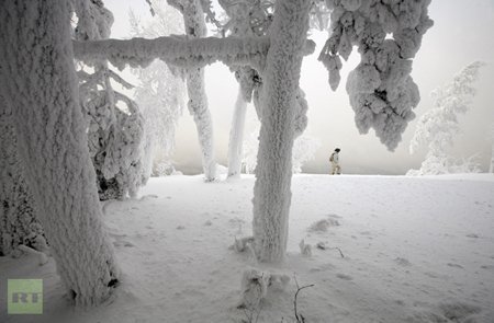 Một phụ nữ bước qua những cành cây bị phủ tuyết và sương muối trên bờ sông Yenisei, với nhiệt độ khoảng -26 độ C, bên ngoài thành phố Krasnoyarsk của Siberia (Nga) hôm 24/12. (Ảnh: Reuters)