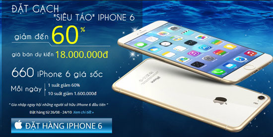Ngoài ra, hệ thống này còn tuyên bố trong thời gian đặt hàng kéo dài 2 tháng (từ 26/8 đến 26/10) sẽ có 660 chiếc iPhone 6 được bán với “giá sốc”, trong đó mỗi ngày sẽ có 1 suất được giảm tới 60% và 10 suất giảm 1,6 triệu đồng (việc lựa chọn người may mắn được dựa vào việc so sánh 6 số cuối trong số điện thoại của người đã đặt mua với kết quả xổ số đặc biệt của một số tỉnh phía Nam - PV).