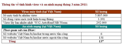 Bkav, trong tháng 3/2011, Việt Nam có 5.805.000 máy tính bị nhiễm virus với hơn