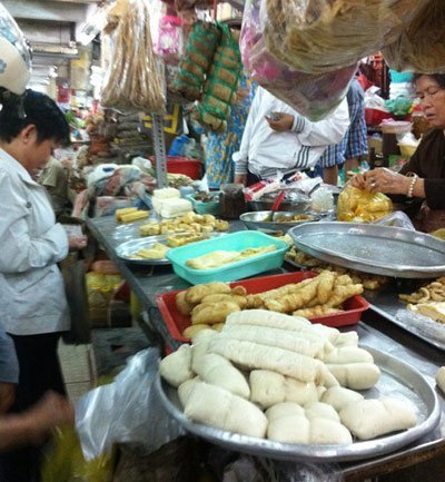 Tại chợ thực phẩm An Đông những ngày cuối năm này tấp nập người mua thực phẩm chay. Những hộp nhựa, mâm nhôm chứa các loại thực phẩm như bánh bánh bao, nem bì, chả lụa bày bán kiểu cân ký, không bao bì nhãn mác, không hạn sử dụng.