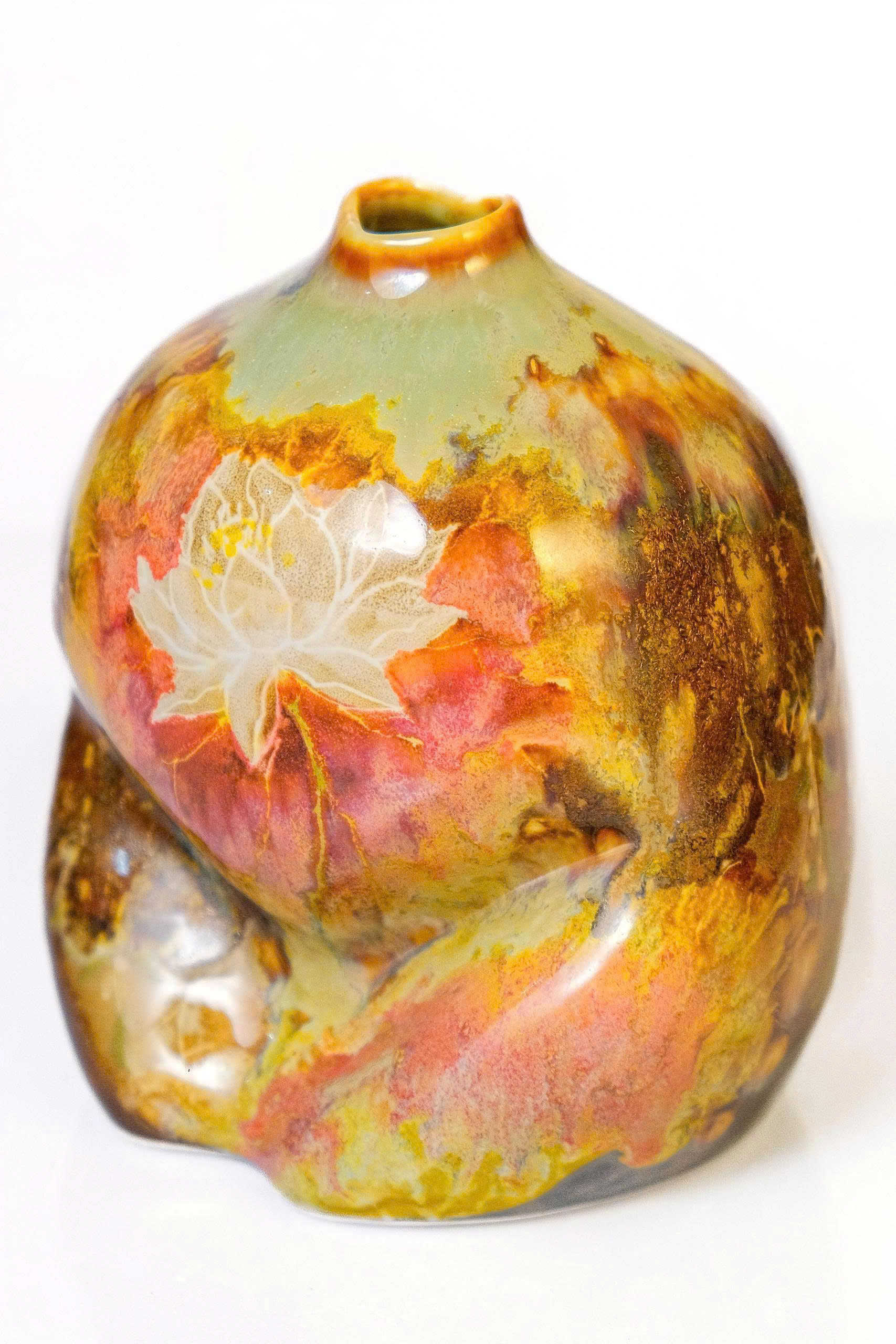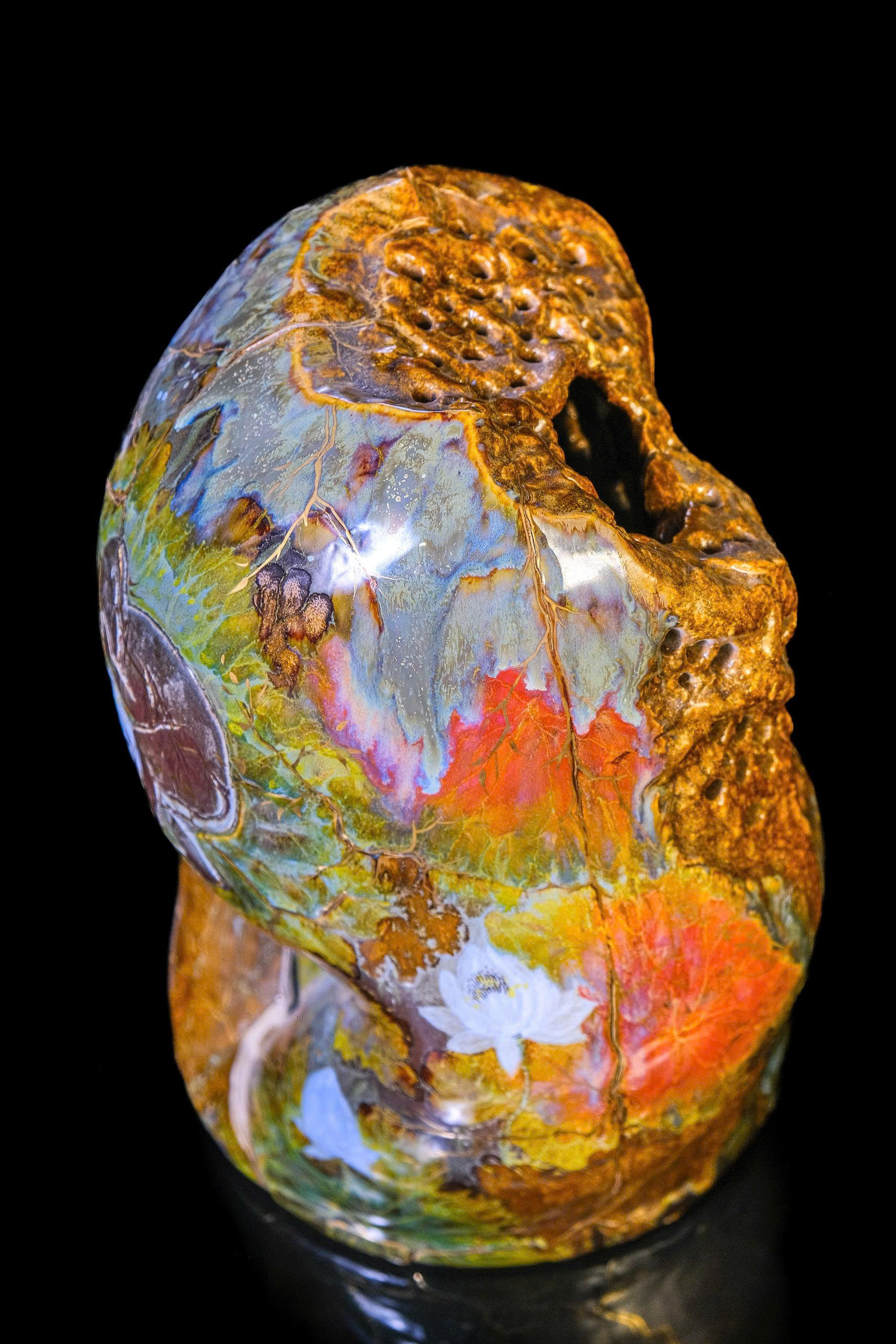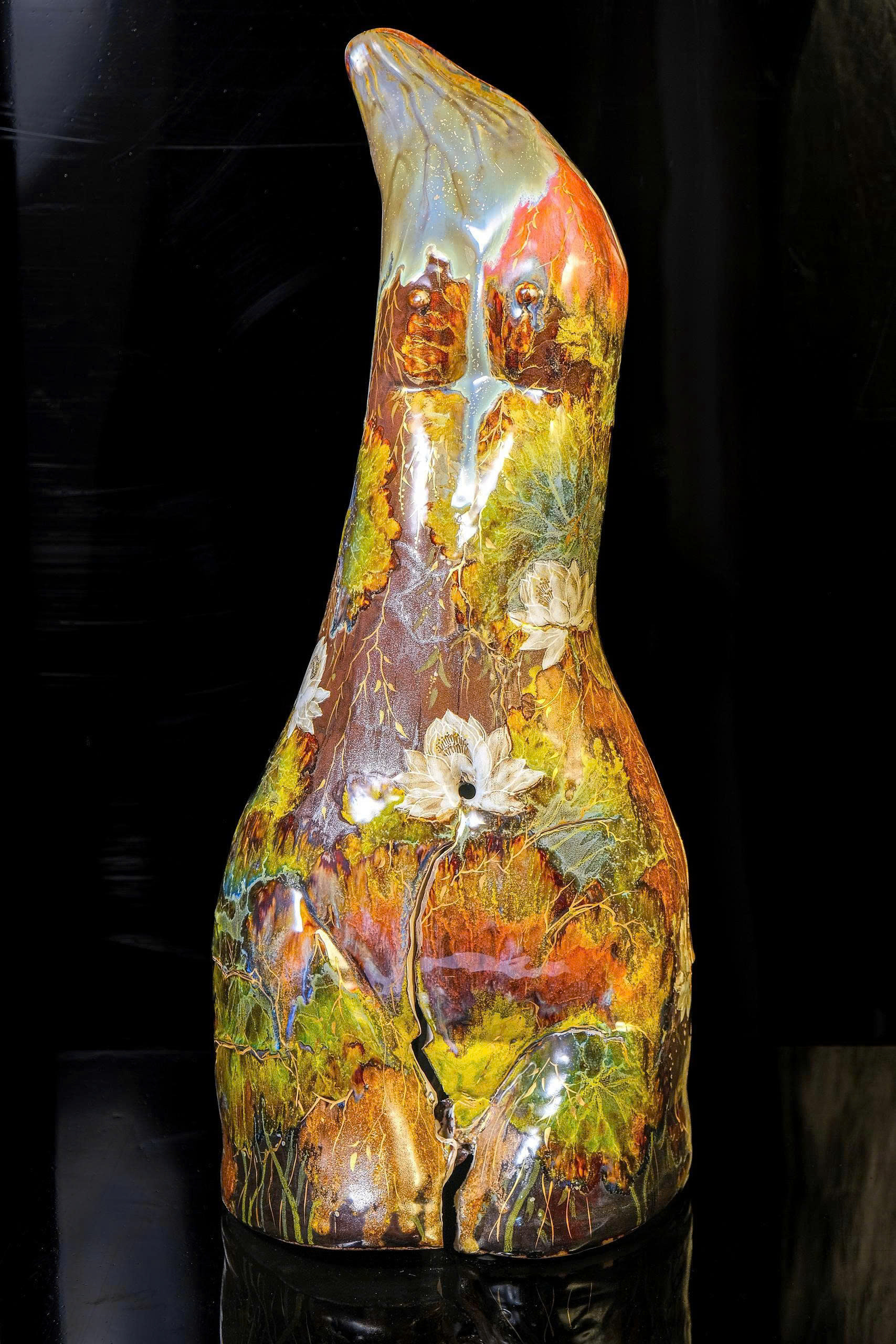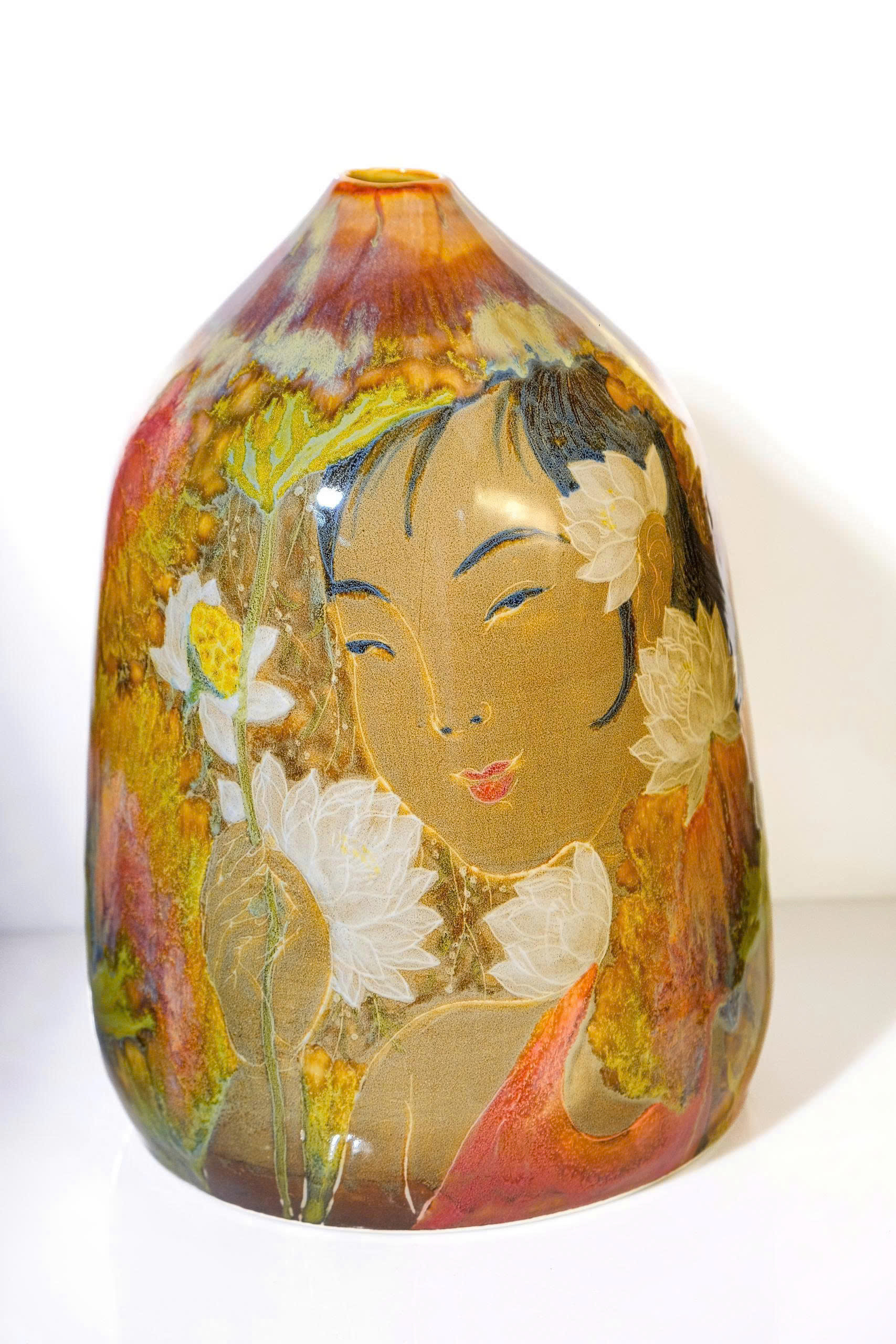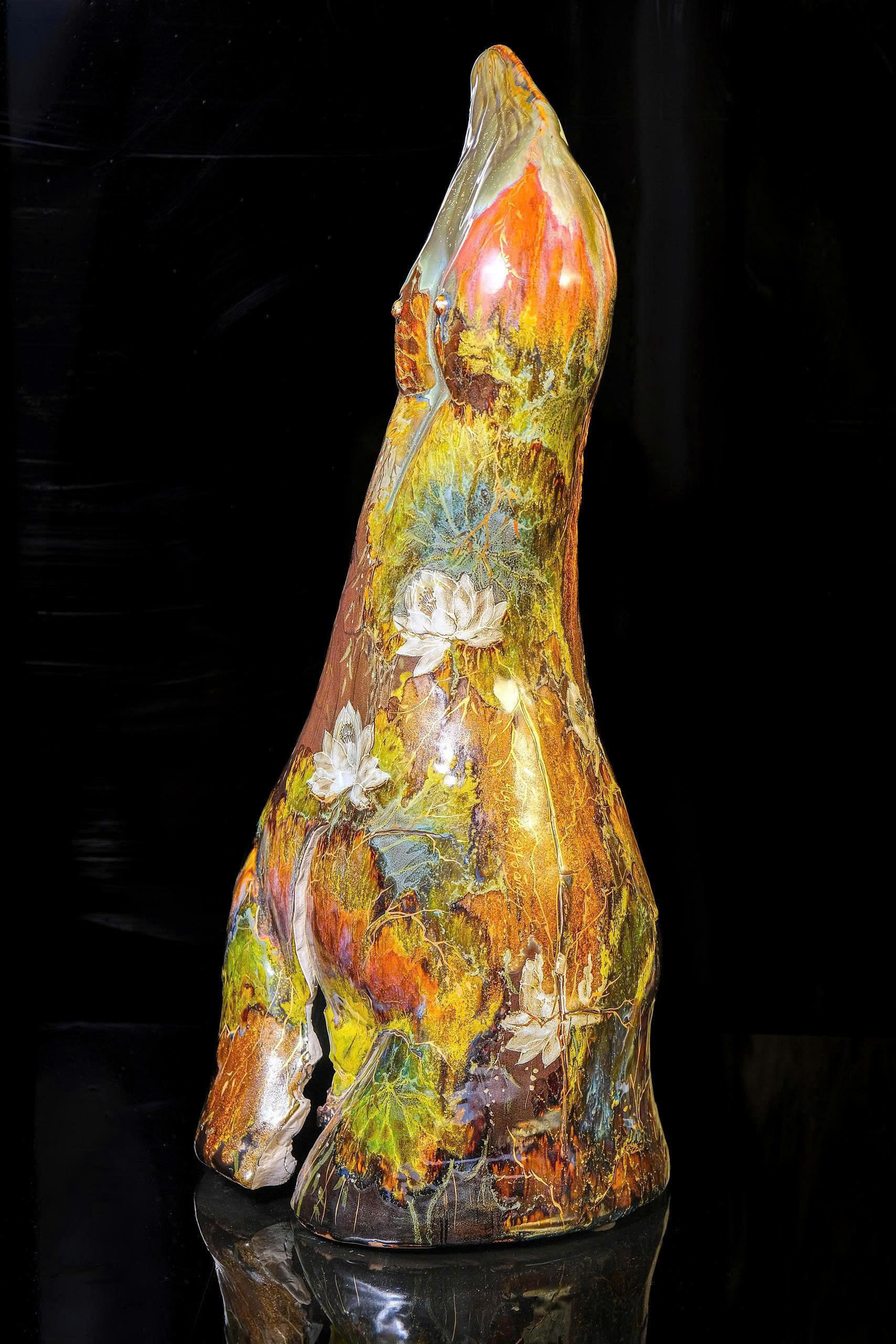 Họa sĩ sử dụng lớp men đa sắc, vẽ nhiều tầng lớp trên nền gốm theo cách tương tự kỹ thuật sơn mài truyền thống nhưng lại mang hơi thở đương đại nhờ sự biến ảo của các dòng men đặc biệt.