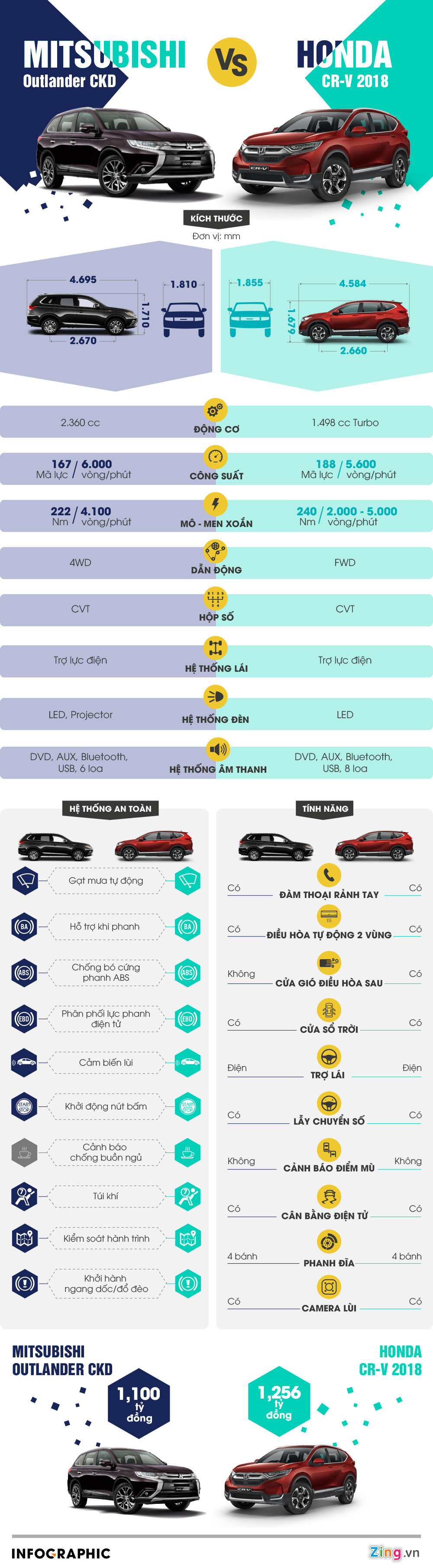 Hai mẫu crossover 5+2 chỗ ngồi cùng được bán tại Việt Nam từ đầu năm 2018. Honda CR-V được nhập khẩu nguyên chiếc từ Thái Lan, trong khi Mitsubishi Outlander lắp ráp trong nước.