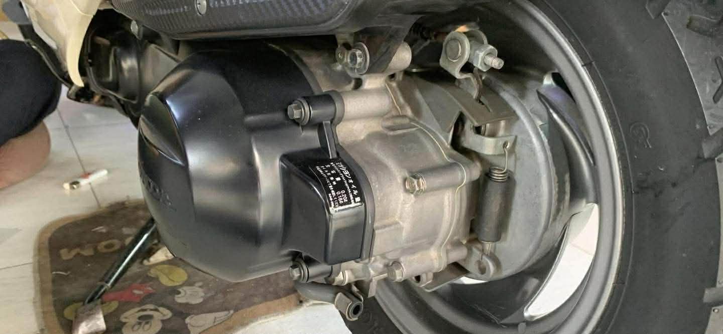 Ở phía sau, cụm động cơ vẫn giữ tình trạng khá nguyên bản. Quan sát phần lốc máy cho thấy các chi tiết kim loại còn sạch, chưa có dấu hiệu bị tháo mở nhiều lần. Các ốc và bu lông vẫn đồng màu, cho thấy động cơ ít bị can thiệp.