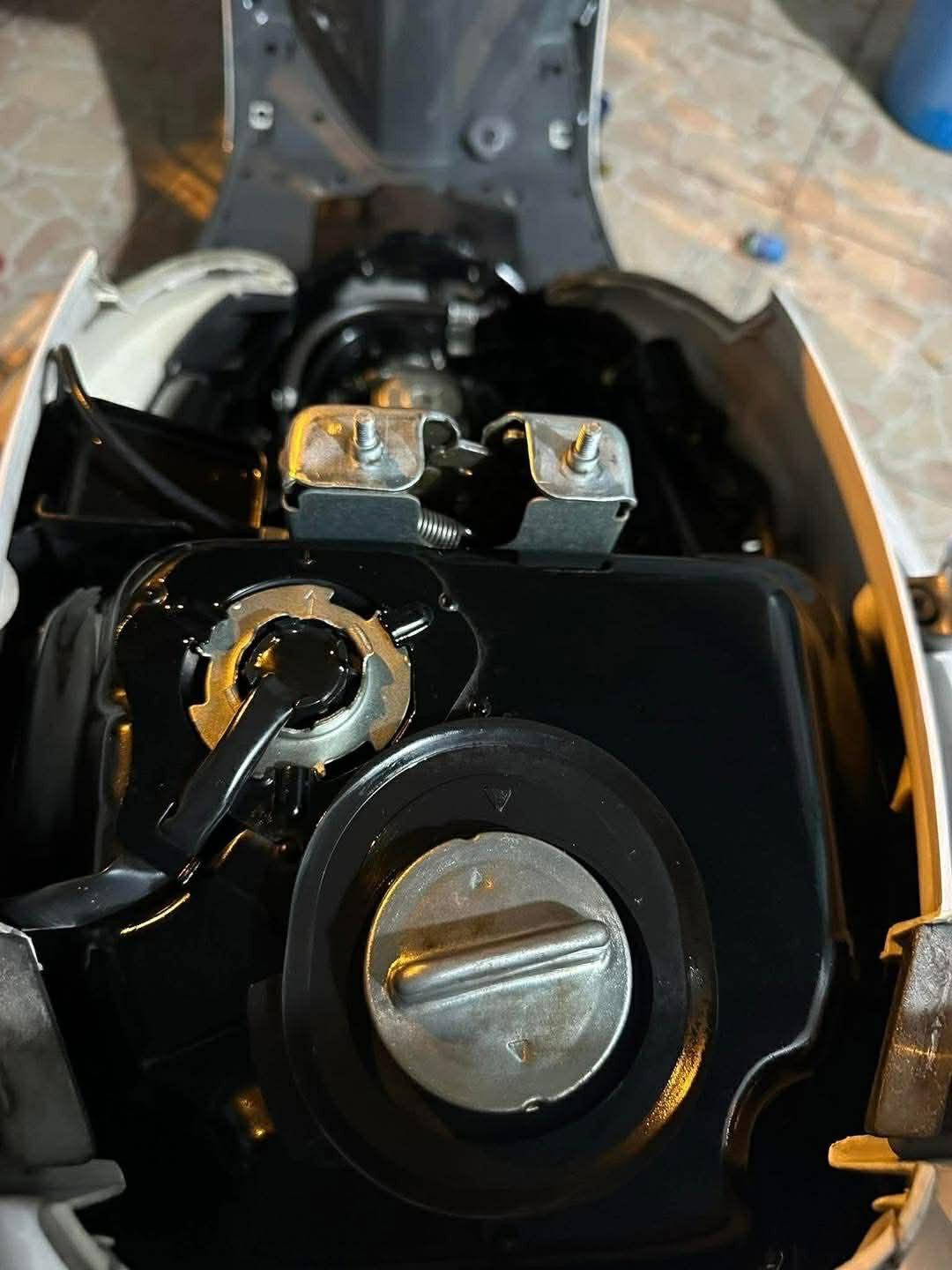 Một điểm đáng chú ý nằm ở khu vực thân giữa của xe với cụm khe gió dạng dọc, đặc trưng cho Spacy đời cuối. Theo anh Nghĩa, phiên bản này sử dụng hệ thống lòng ống hơi dạng “turbo”, trong khi các đời Spacy cũ không có chi tiết này. Bên cạnh đó, vị trí hộp IC cũng được đặt phía sau mặt nạ cổ xe, thay vì nằm dưới sàn để chân như các thế hệ trước.