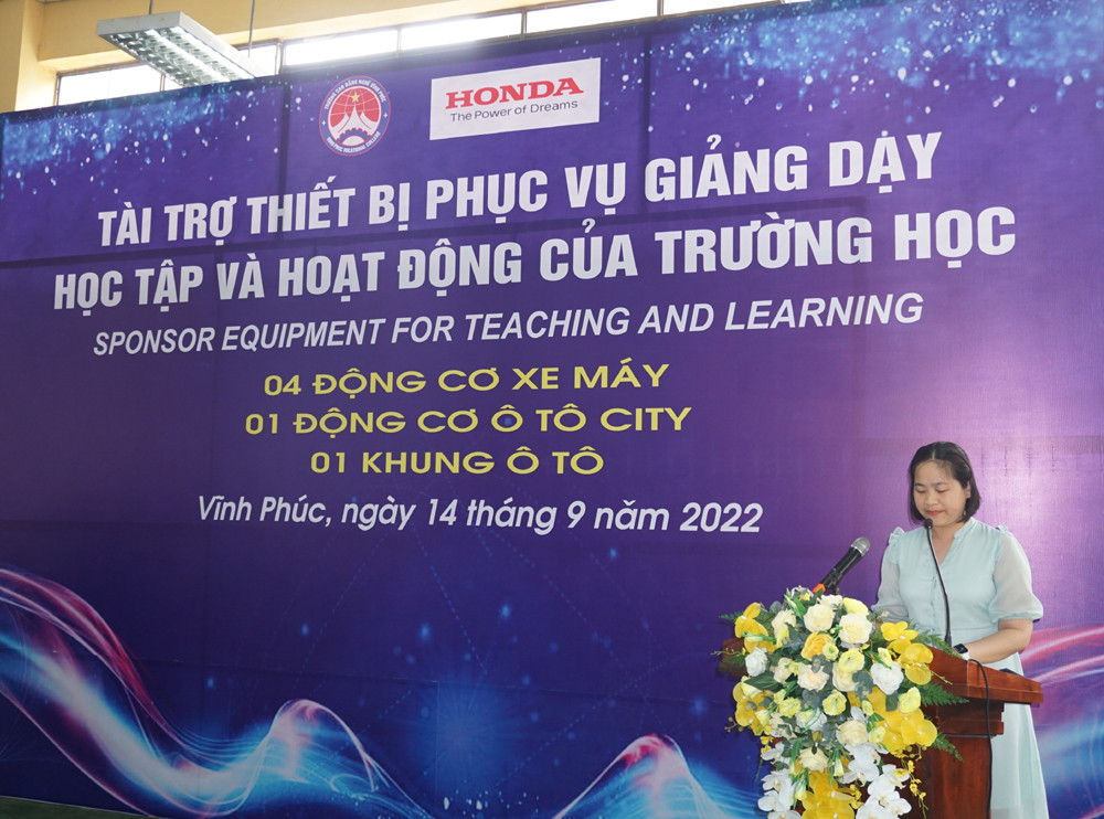 Phát biểu tại buổi lễ, bà Nguyễn Kim Thoa - Trưởng phòng Hành chính đại diện HVN chia sẻ: “Là một doanh nghiệp sản xuất kinh doanh trong lĩnh vực ô tô - xe máy tại Việt Nam, trải qua hơn 26 năm hình thành và phát triển, HVN rất vui mừng khi không chỉ đóng góp vào sự phát triển kinh tế đất nước mà còn đóng góp vào sự phát triển tương lai của thế hệ trẻ Việt Nam. Thông qua các hoạt động hỗ trợ giáo dục tích cực và hiệu quả, HVN mong rằng sẽ hiện thực hóa mô hình thực hành nghề tốt nhất cho các học viên, từ đó đem lại hành trang vững chắc cho thế hệ trẻ và tạo ra nguồn nhân lực chất lượng tại Vĩnh Phúc và Hà Nam nói riêng, cũng như Việt Nam nói chung”.