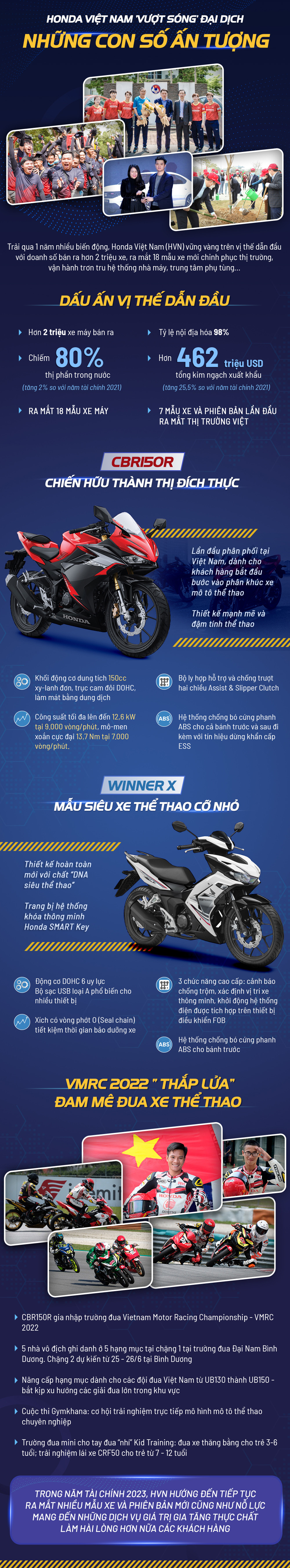 Trải qua 1 năm nhiều biến động, Honda Việt Nam (HVN) vững vàng trên vị thế dẫn đầu với doanh số bán ra hơn 2 triệu xe, ra mắt 18 mẫu xe mới chinh phục thị trường, vận hành trơn tru hệ thống nhà máy, trung tâm phụ tùng…