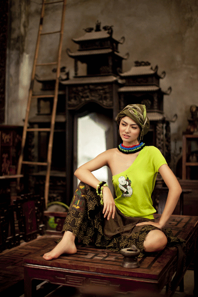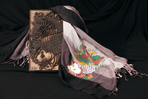 Chiếc khăn choàng trong bộ sưu tập có chất liệu hình ảnh lấy từ tranh điêu khắc Đông Hồ. Nhà thiết kế Hồ Trần Dạ Thảo từng có bộ sưu tập Đông Hồ - Tôi yêu văn hóa Việt Nam được triển lãm tại Bangkok.