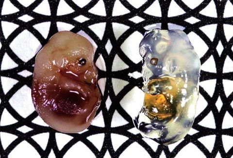 | Bào thai chuột được ngâm nước muối (trái) so với bào thai chuột được ngâm trong dung dịch Scale (phải). Ảnh: NatGeo |