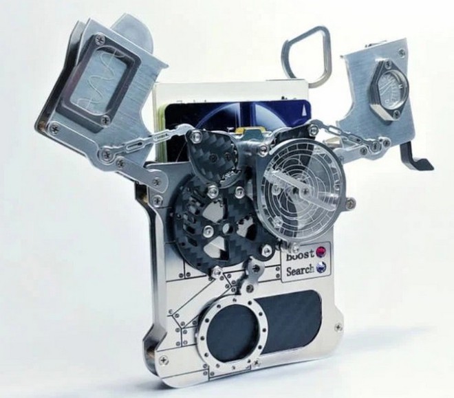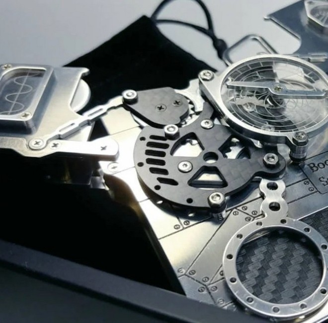 Chiếc hộp đựng thẻ trông có vẻ điên rồ và như thể đến từ tương lai này là sản phẩm của công ty thiết kế SM Factory, Nhật Bản. Chiếc hộp đựng này làm hoàn toàn bằng hợp kim nhôm và carbon duralumin với hệ thống bánh răng dày đặc và các chốt liên kết với nhau.